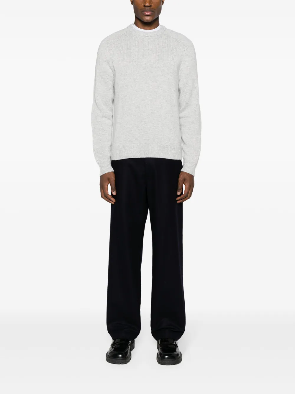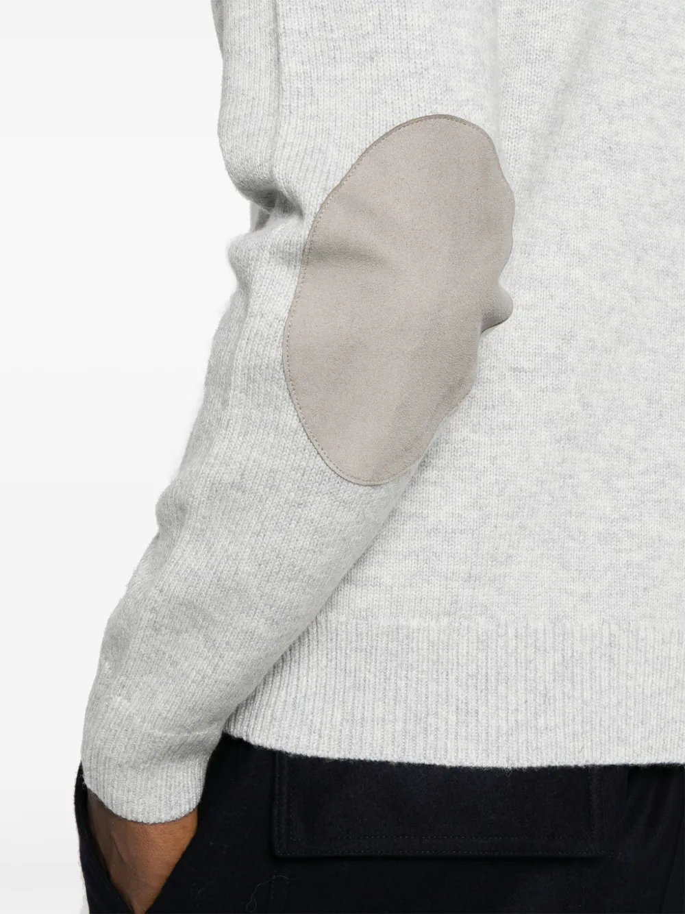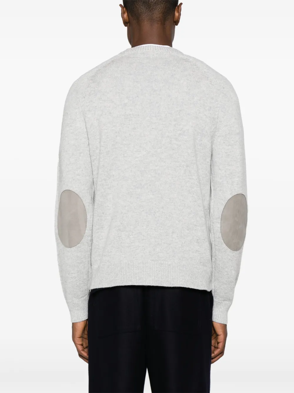 Светло-серый, смесь шерсти и кашемира, трикотаж в рубчик, круглый вырез, длинные рукава реглан, заплатки на локтях и прямой подол.
