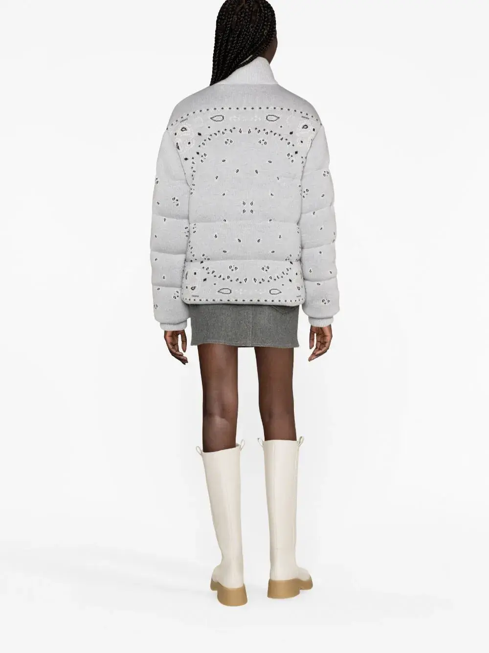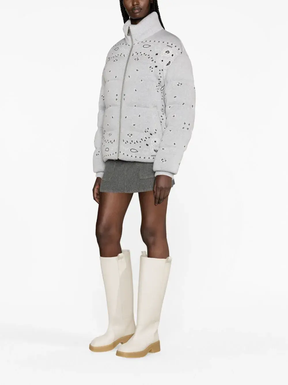 Серый, необработанная шерсть, наполнитель из пуха и перьев, узор пейсли, высокий воротник, застежка на молнии спереди, длинные рукава, манжеты в рубчик, два вшитых кармана по бокам и прямой подол.