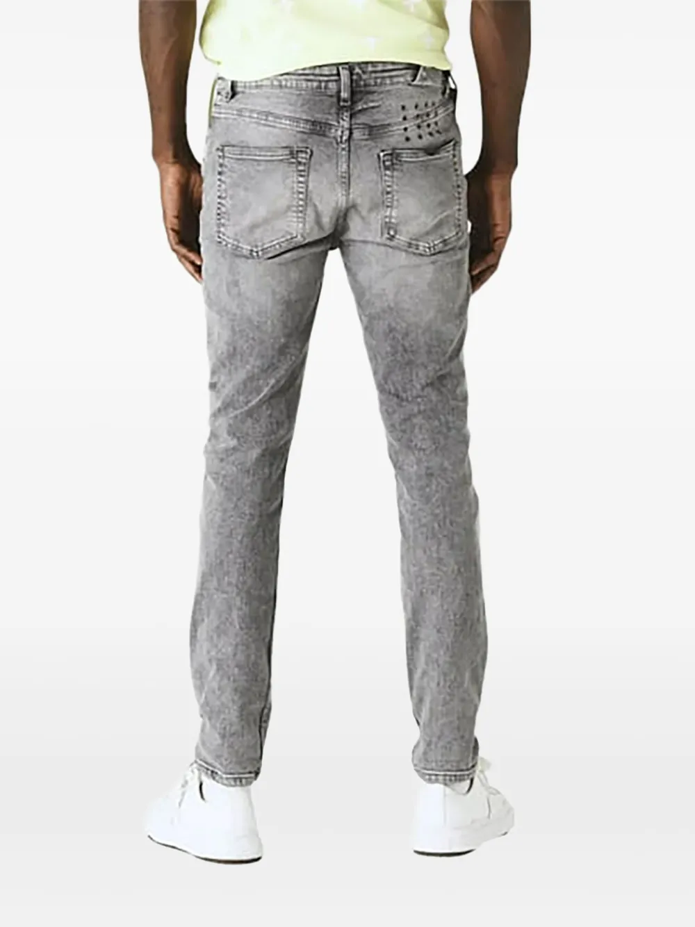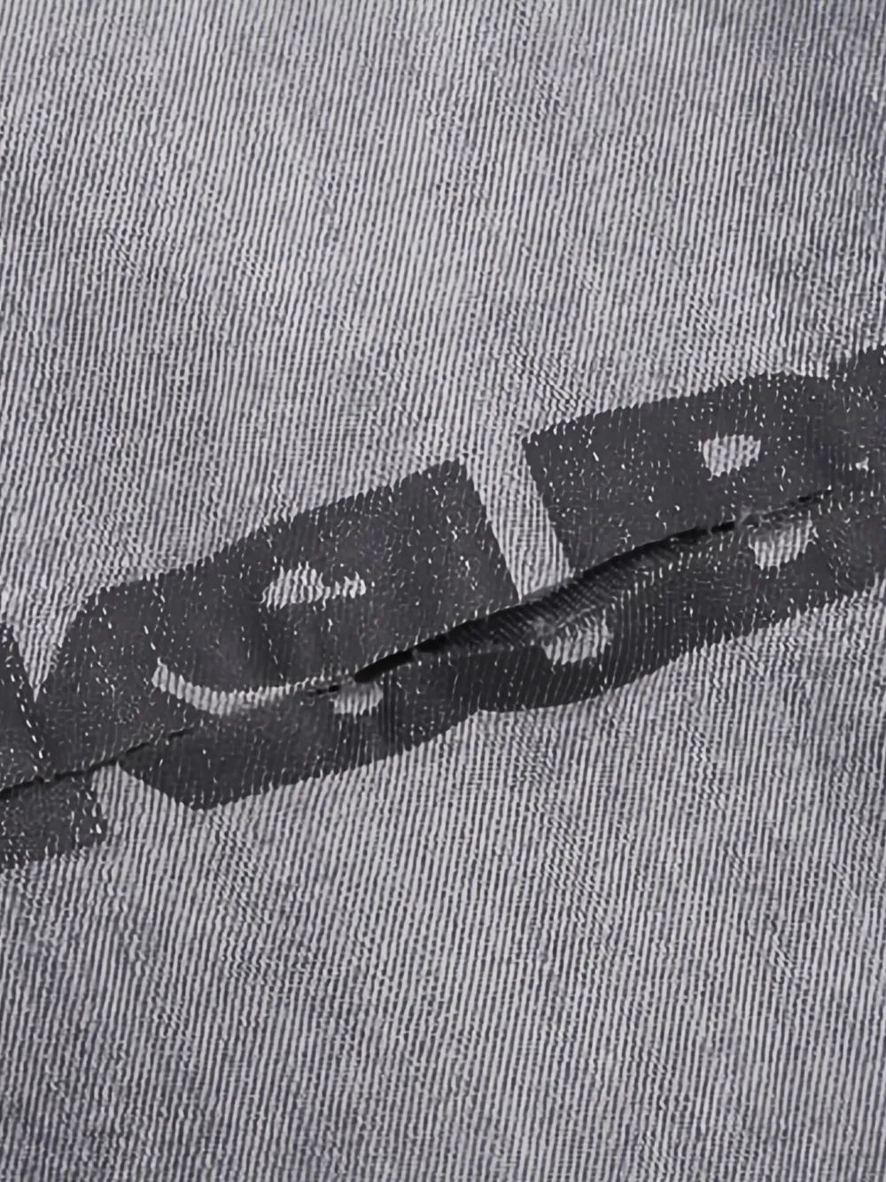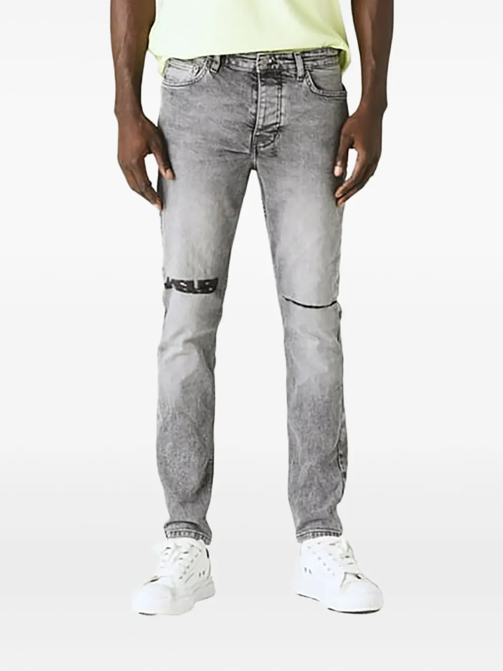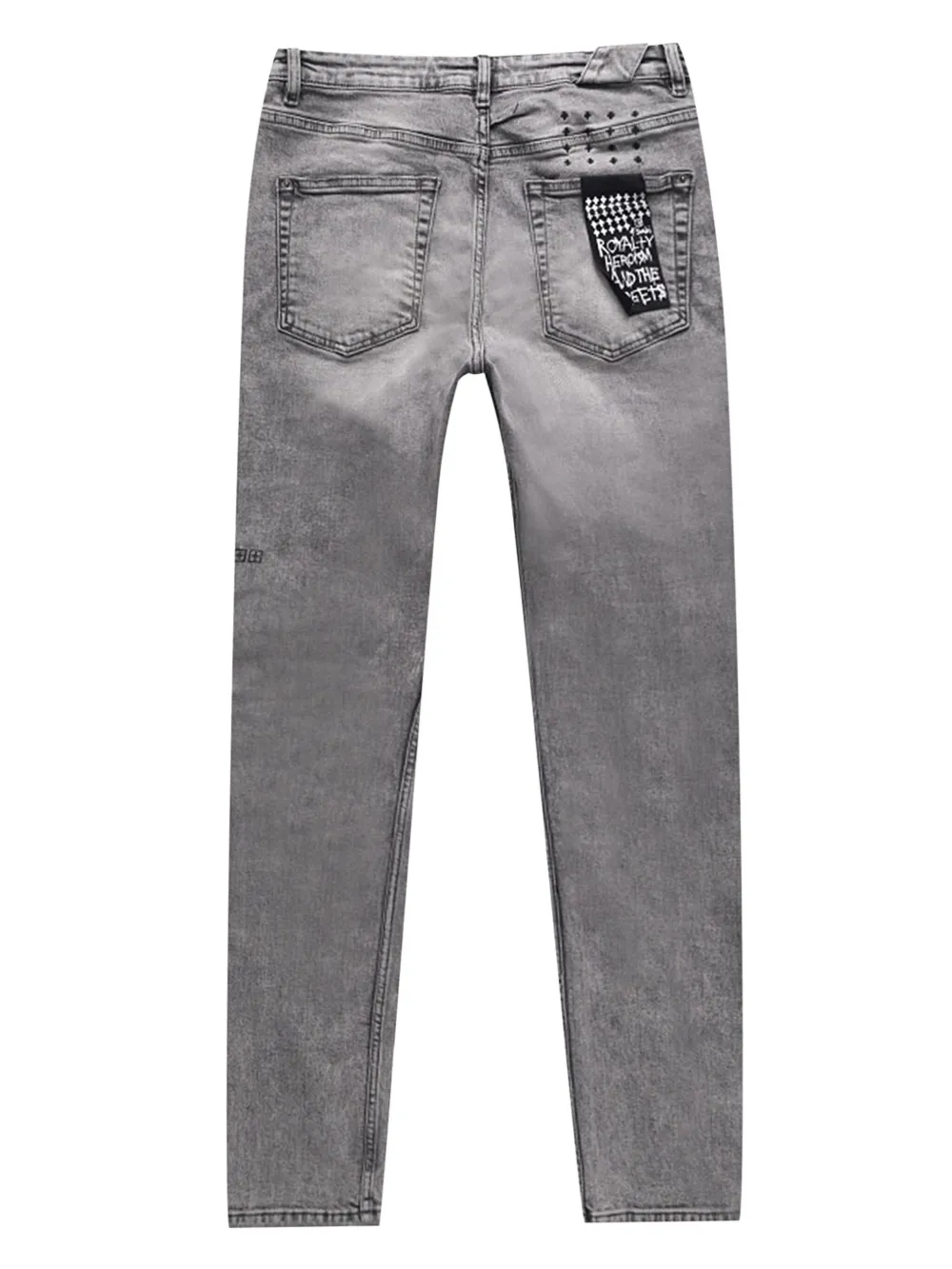 Средне-серый, потайная застежка на пуговицы, шлевки для ремня, пять классических карманов, принт с логотипом на штанине, рваные детали, нашивка с логотипом сзади