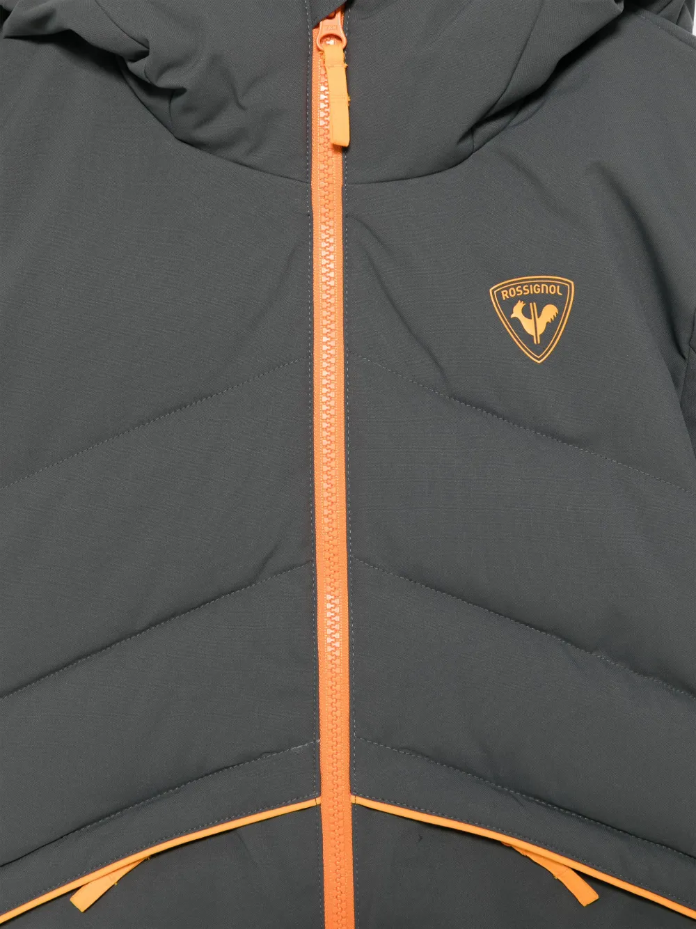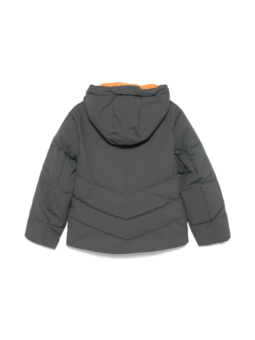 Подробнее о товаре: • серый • дутый материал • стеганная модель • водонепроницаемый материал • застежка на молнии спереди • воротник-стойка • объемный капюшон • длинные рукава • карман на рукаве • эластичные манжеты • вырезы для больших пальцев • отделка лентой с логотипом • карманы на молнии спереди • цельная подкладка • внутренний карман на молнии • снежная юбка • прямой подол