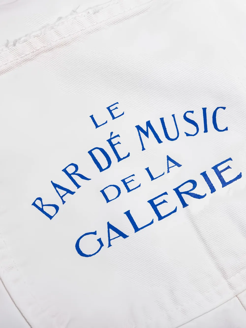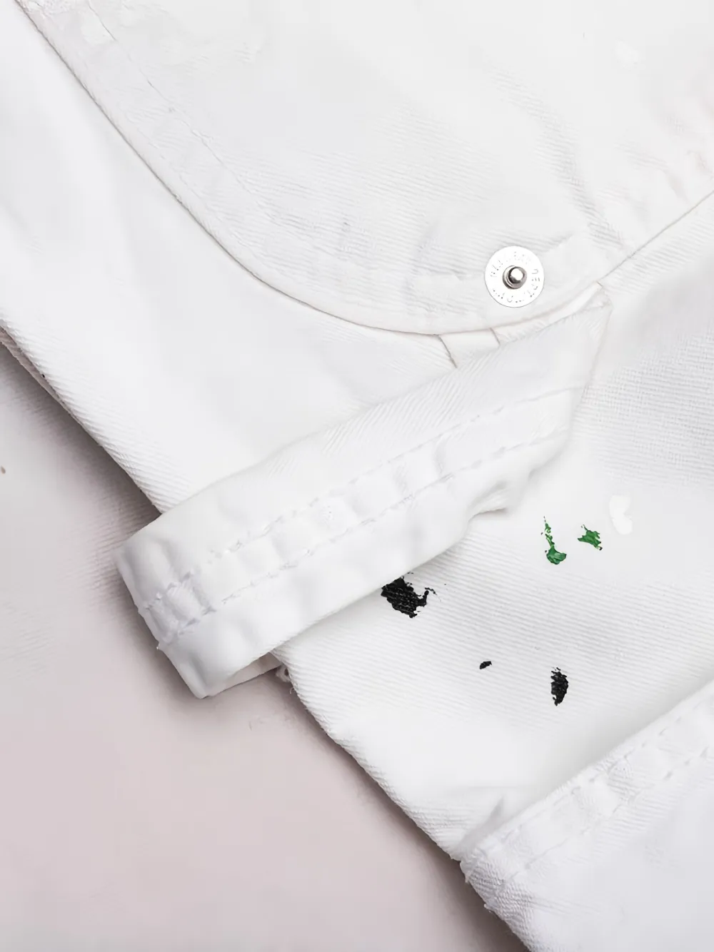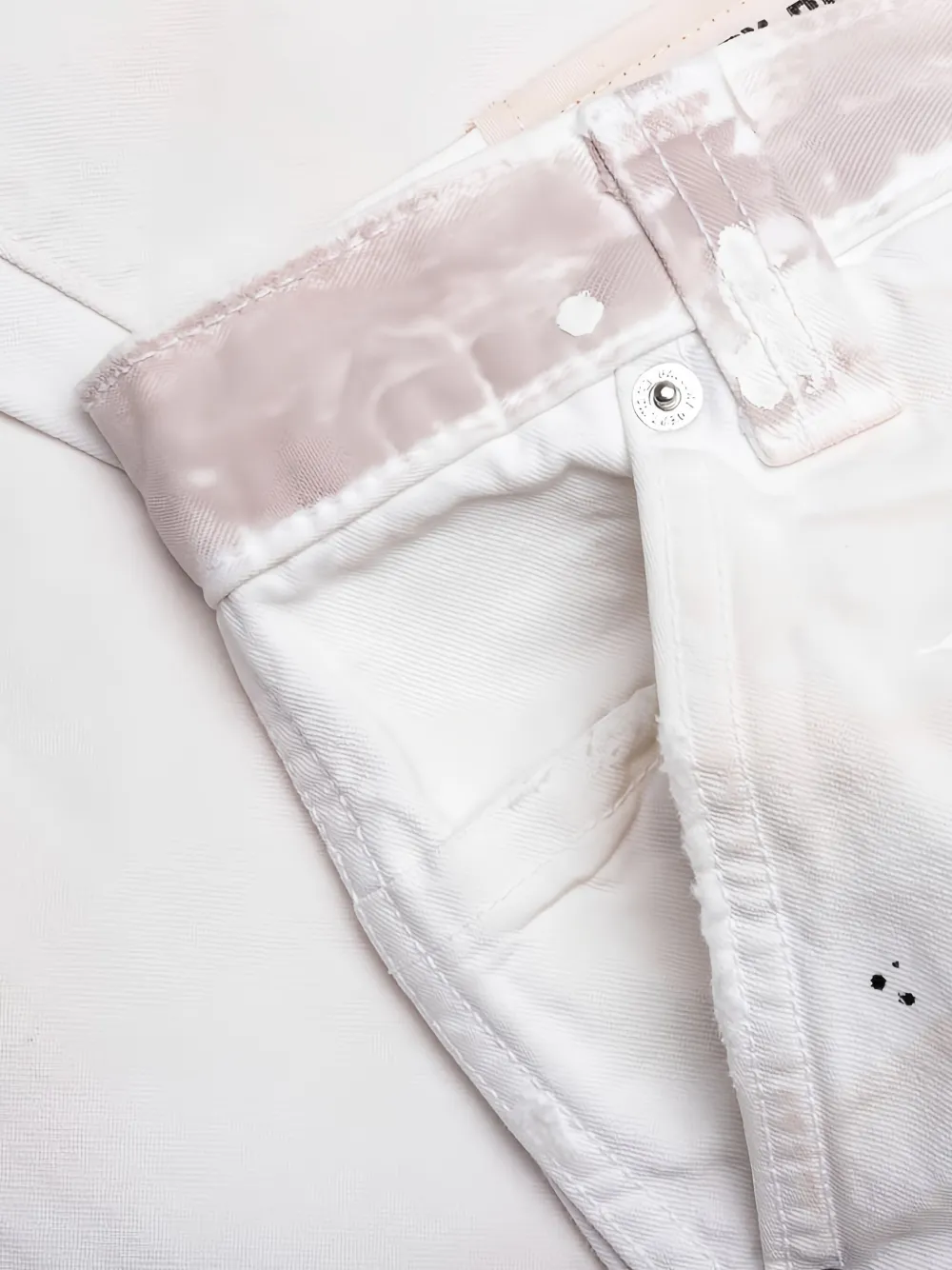 Брызги краски не совсем белого цвета, кожаный пояс, принт в стиле бар-де-ла-галерея, ширинка на пуговицах