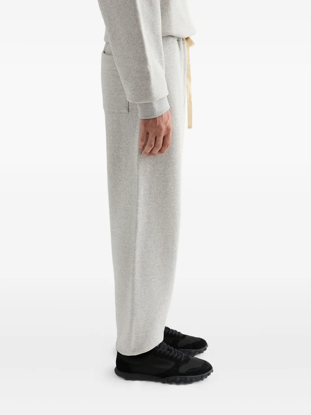 Эластичный пояс из серого хлопка, затягивающийся на шнурок, прорезные карманы, накладной карман, логотип