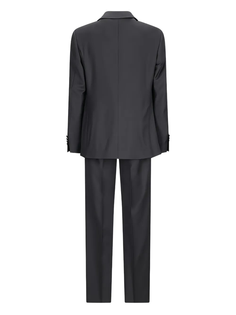 Черные заостренные лацканы, застежка на одну пуговицу, прямые брюки, прорезные карманы