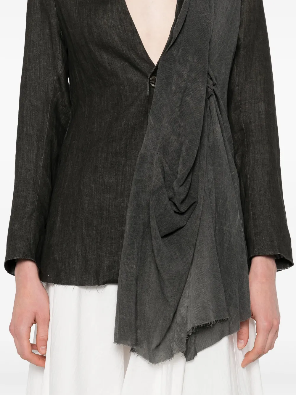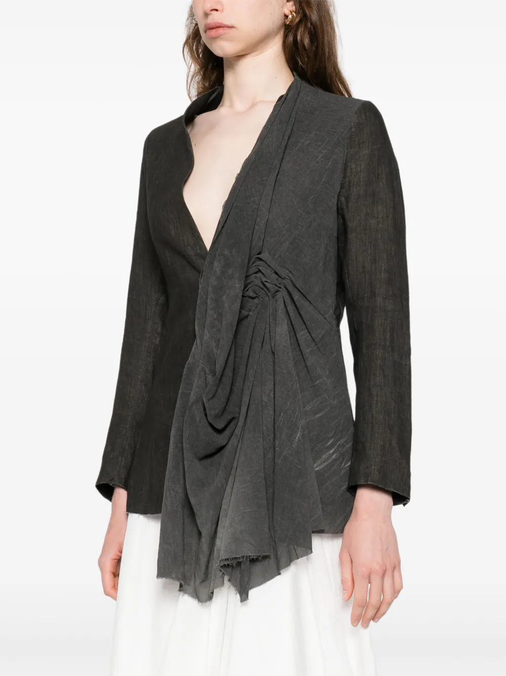 Темно-серый цвет, застежка на пуговицы спереди, V-образный вырез, длинные рукава, присборенные детали, асимметричный дизайн