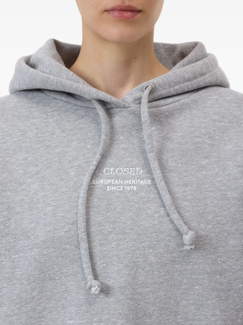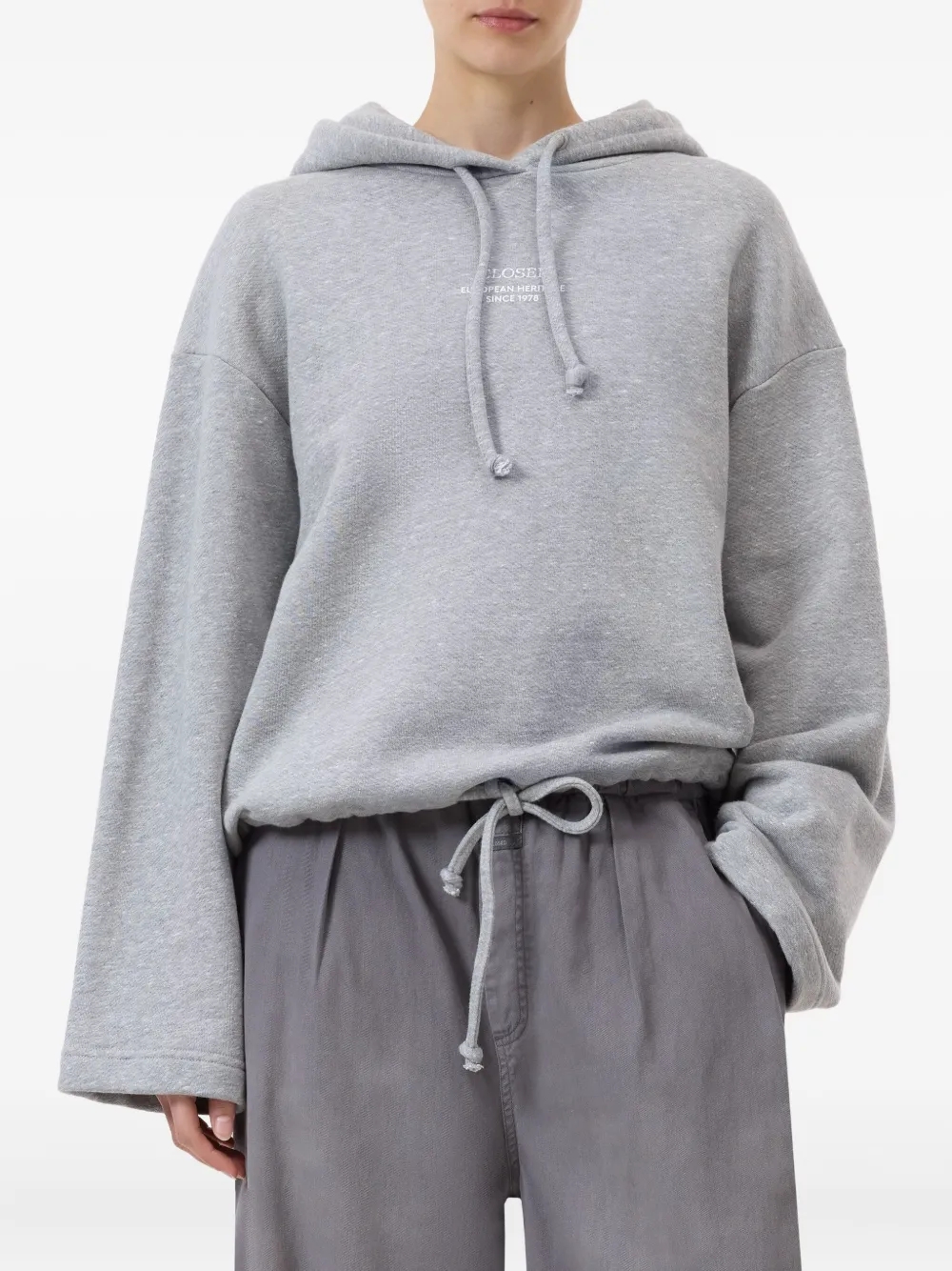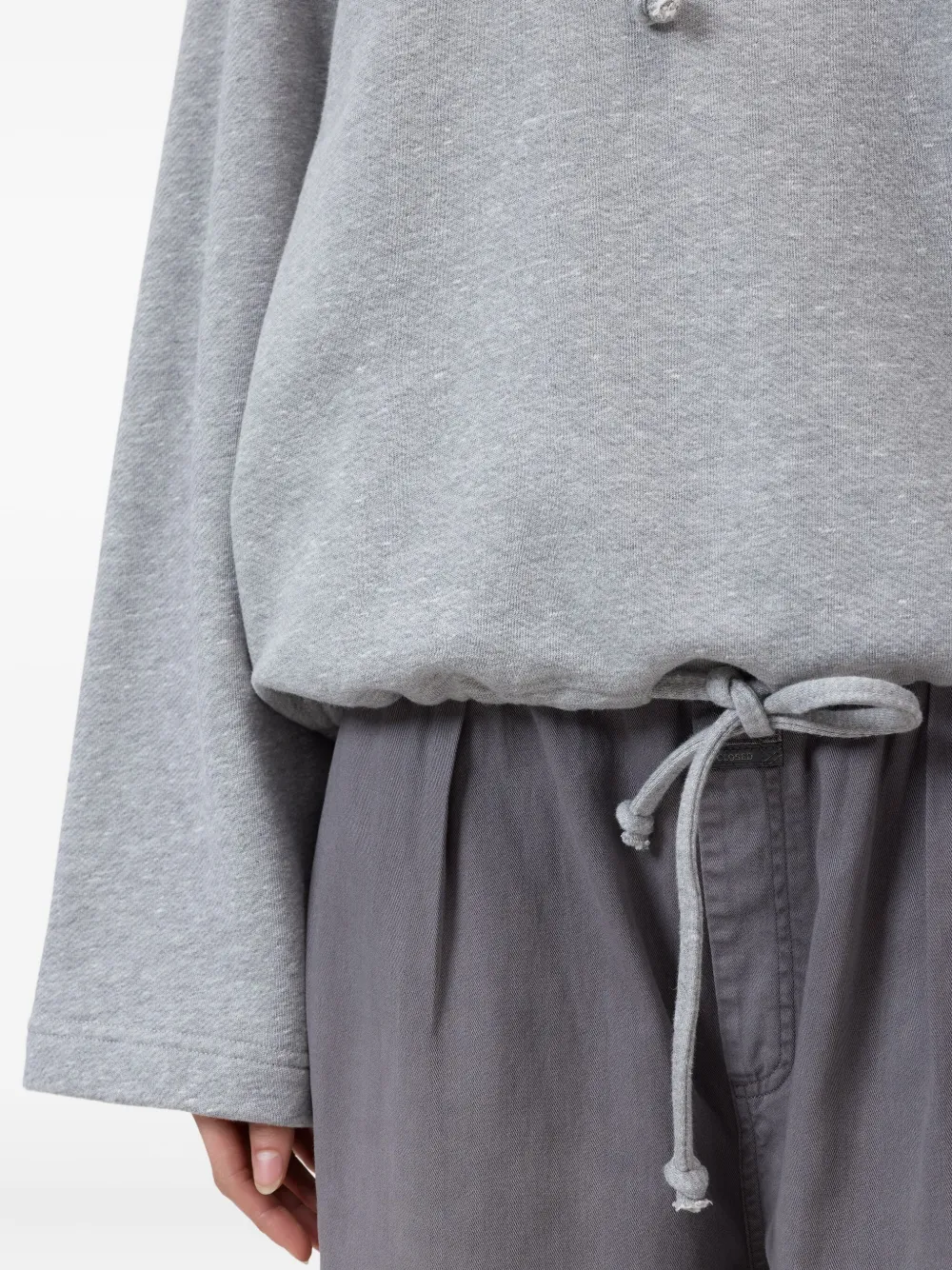 Серый меланжевый капюшон с завязками, затягивающийся шнурком подол, длинные рукава