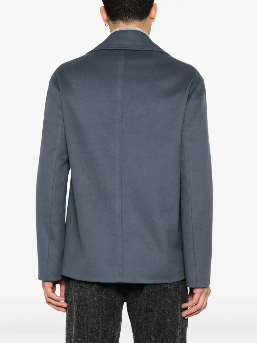 Серый двубортный пиджак, застежка на золотистые пуговицы, зазубренные лацканы, накладные карманы, длинные рукава