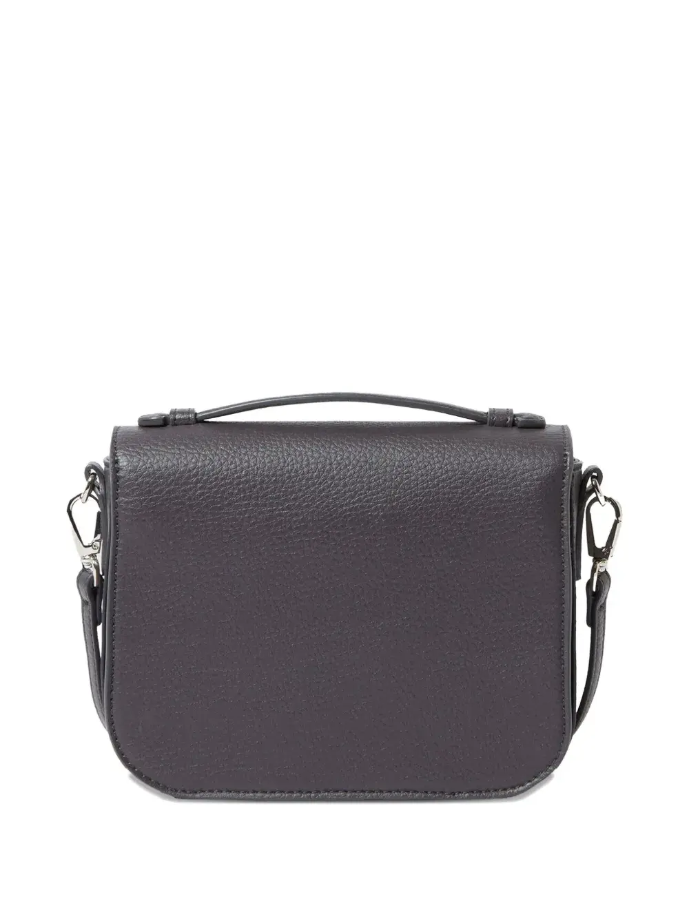 Темно-серый, с текстурой гальки, круглая пластинка с логотипом, верхняя ручка, съемный плечевой ремень, застежка на кнопку