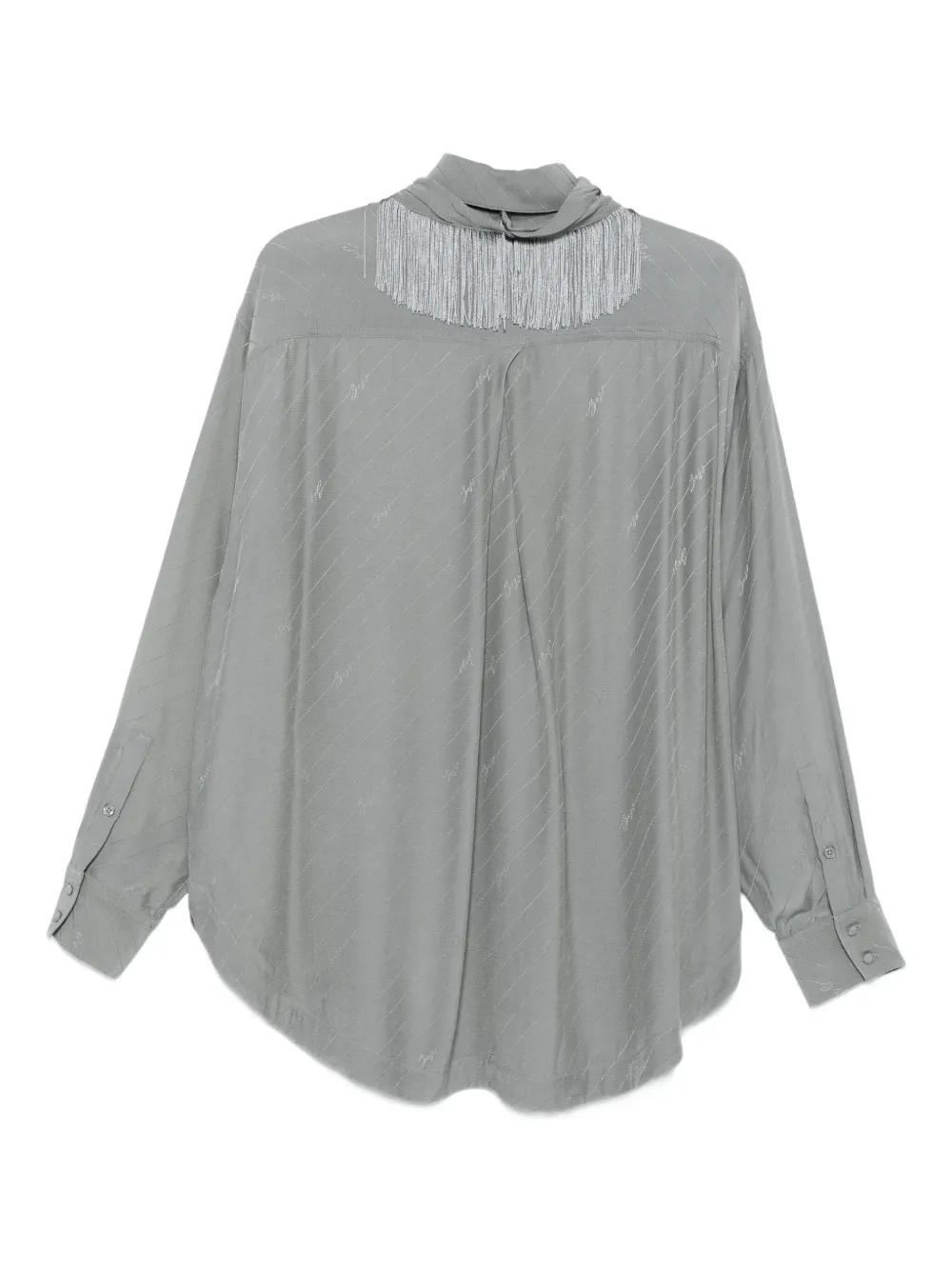 Серый воротник-хомут, длинные рукава, пуговицы на манжетах, отделка бахромой