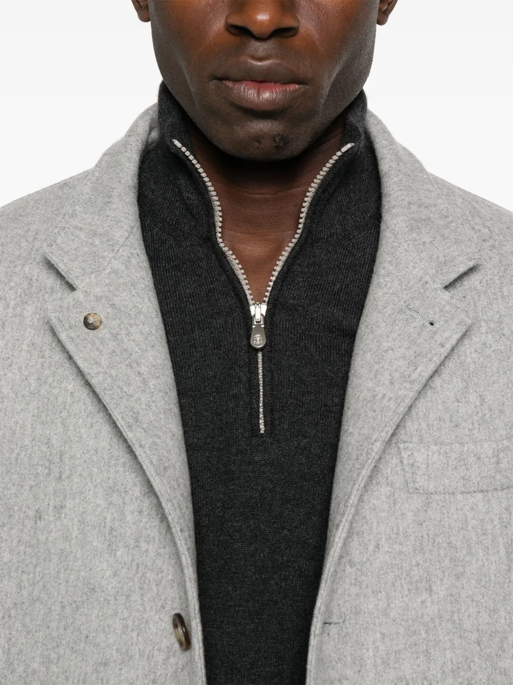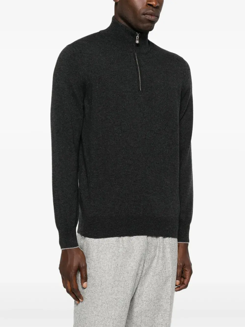 Серая застежка-молния спереди наполовину, длинные рукава, ребристые манжеты и подол, закругленный подол