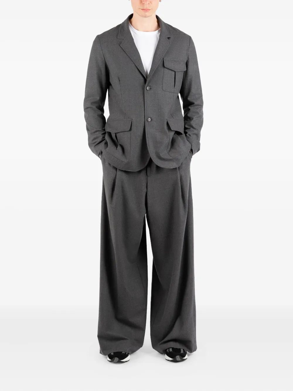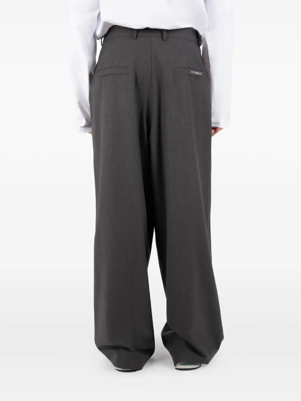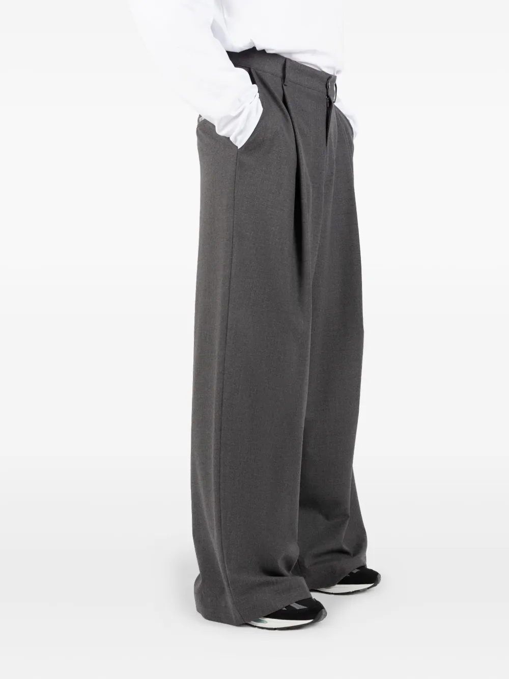 Серые складки спереди, широкие штанины, застежка на пуговицы, прорезные карманы, прямой подол