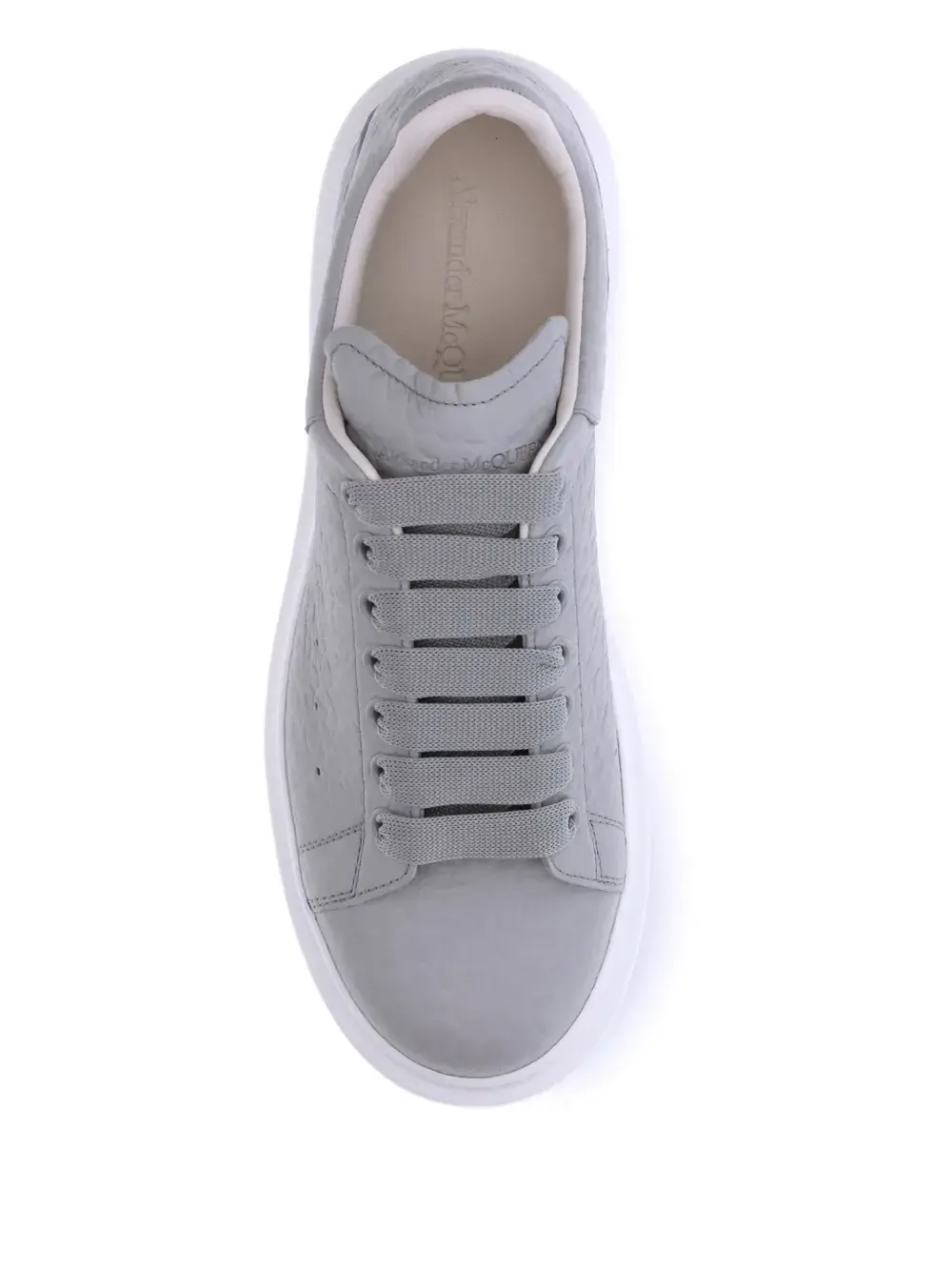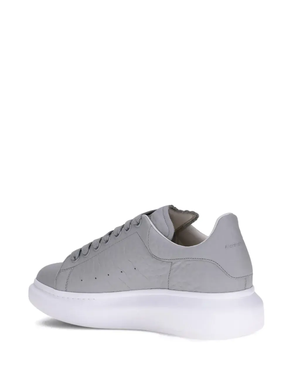 Серая кожа, перфорированная деталь, шнуровка, резиновая подошва, круглый носок. Чтобы уменьшить воздействие на окружающую среду и сократить потребление хлопка, Alexander McQueen больше не будет комплектовать кроссовки мешком для пыли.