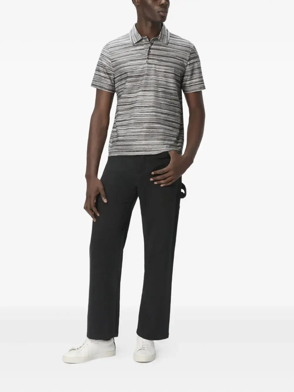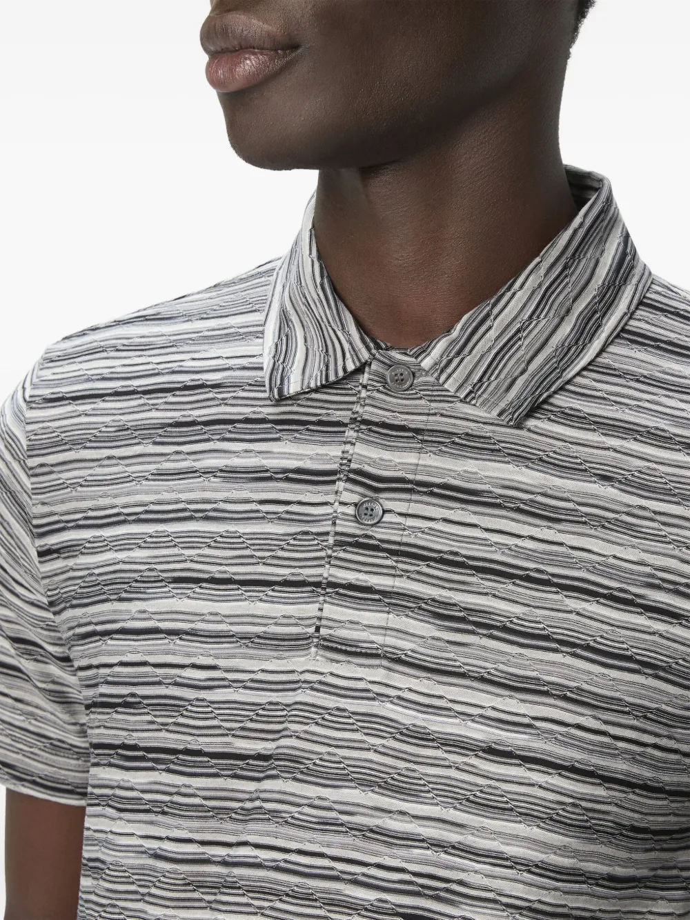 Серый, горизонтальные полосы, короткие рукава, воротник-поло, застежка на пуговицы. Полученный вами товар может незначительно отличаться от представленного на фотографии. Это связано с тем, что все изделия Missoni изготавливаются вручную.
