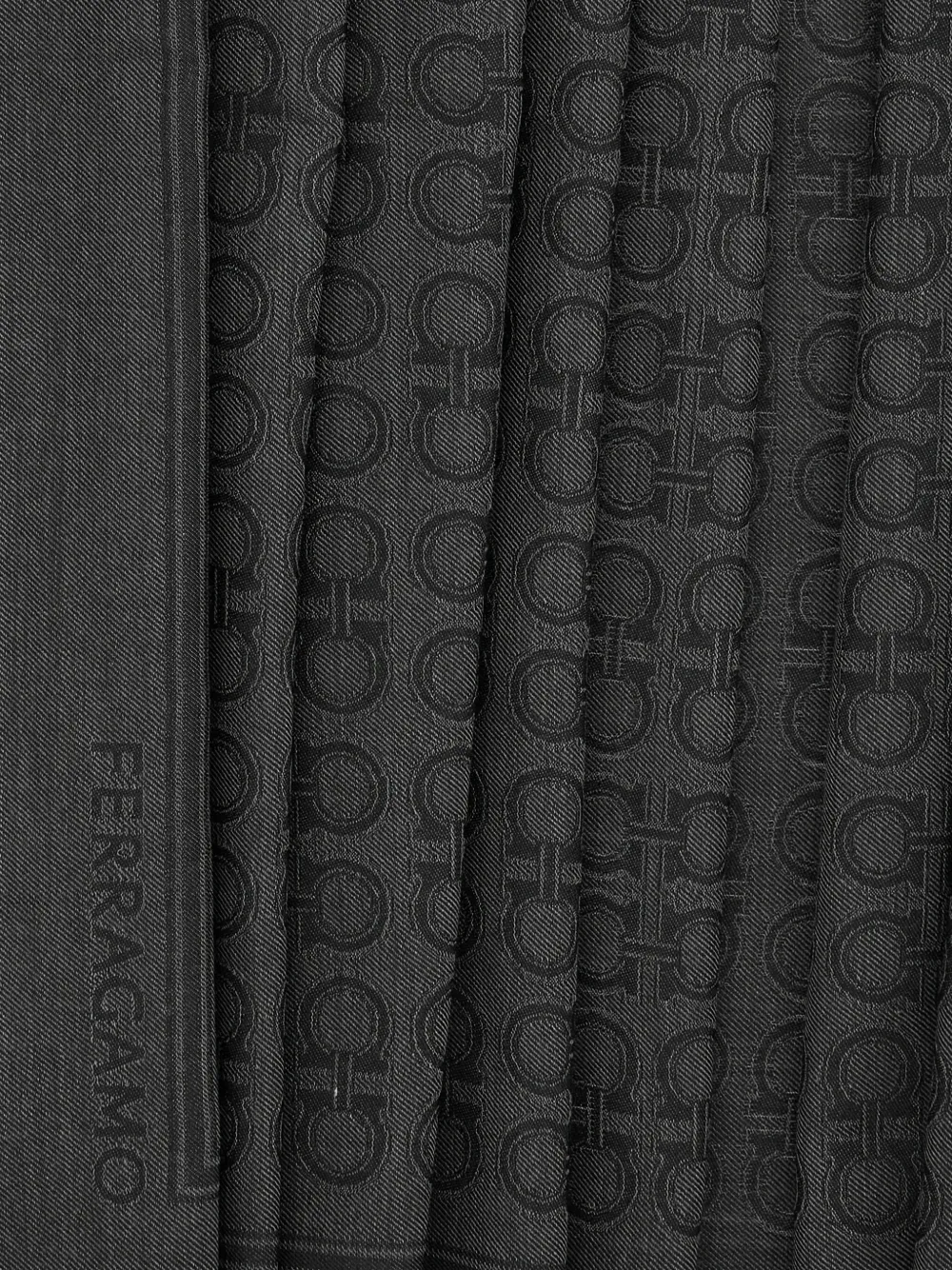 Темно-серый прямоугольный дизайн, мотив Gancini по всей поверхности, логотип, бахрома по краям, смесь шерсти и шелка