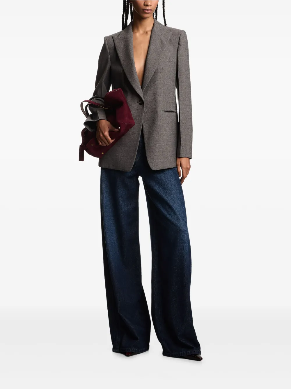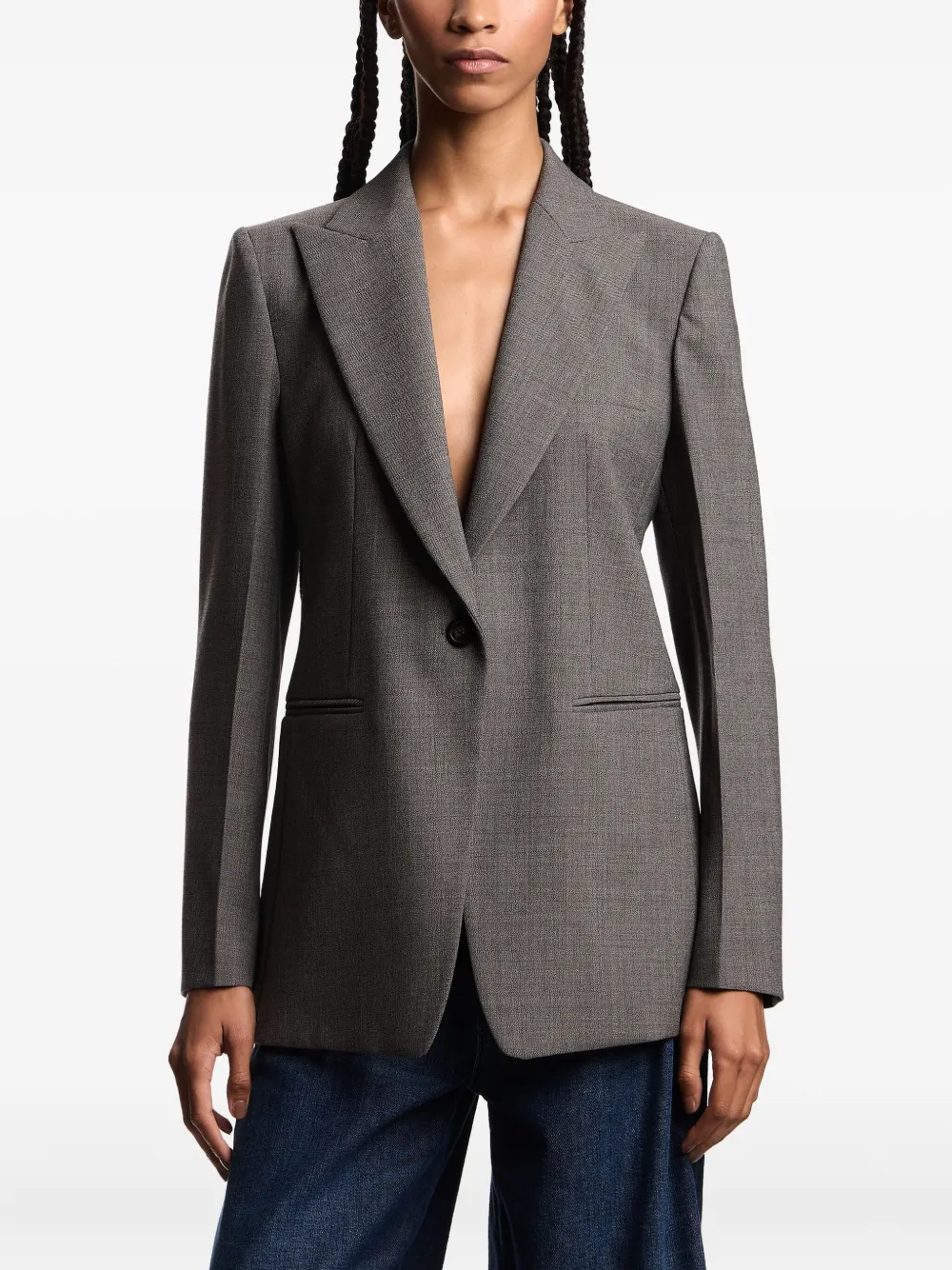 Серый, застежка на одну пуговицу, прорезной карман, отложной воротник, прямой подол, длинные рукава