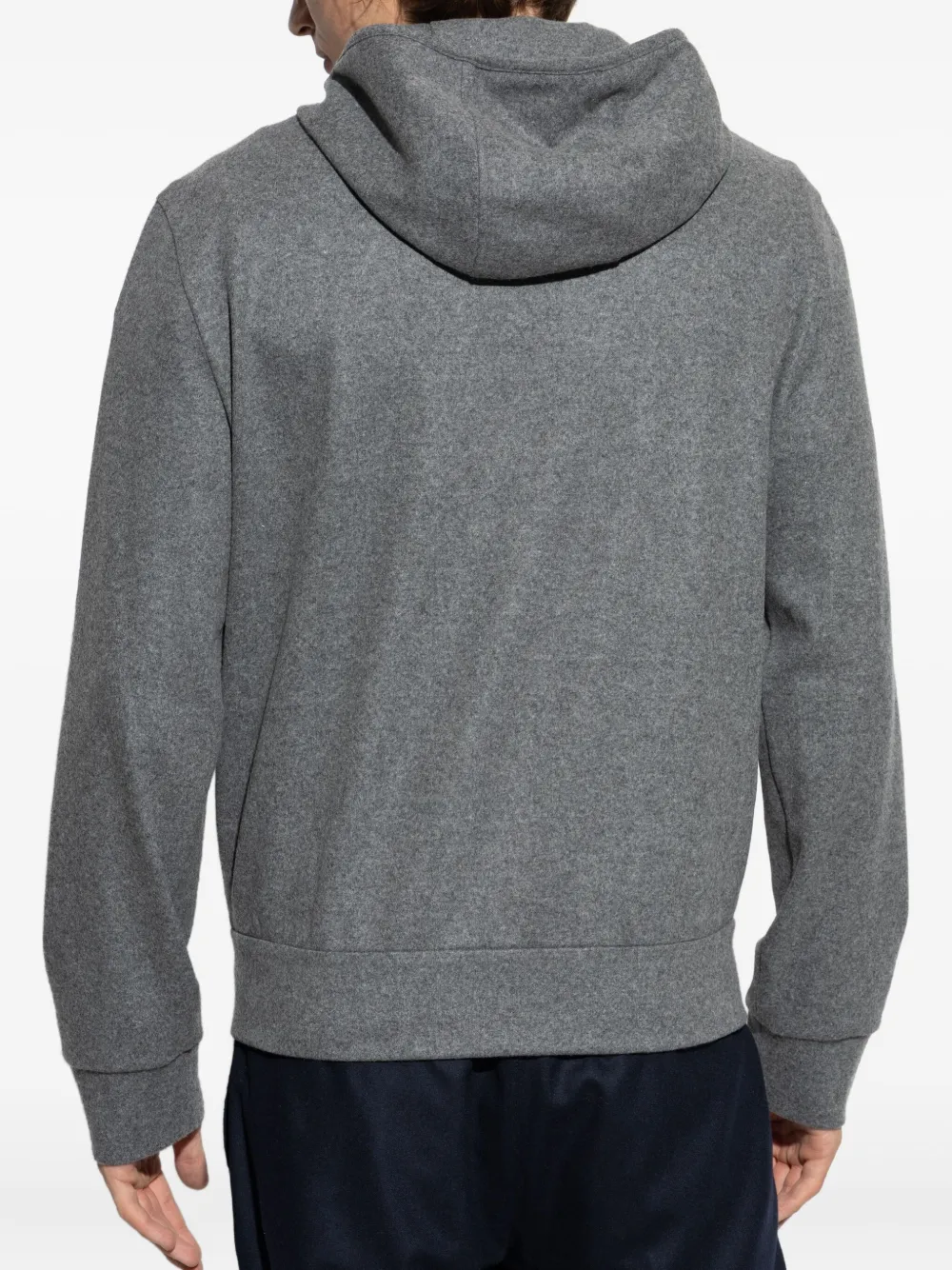 Серый классический капюшон, застежка на кнопку спереди, прорезные карманы по бокам, потайная застежка-молния спереди, нашивка с логотипом