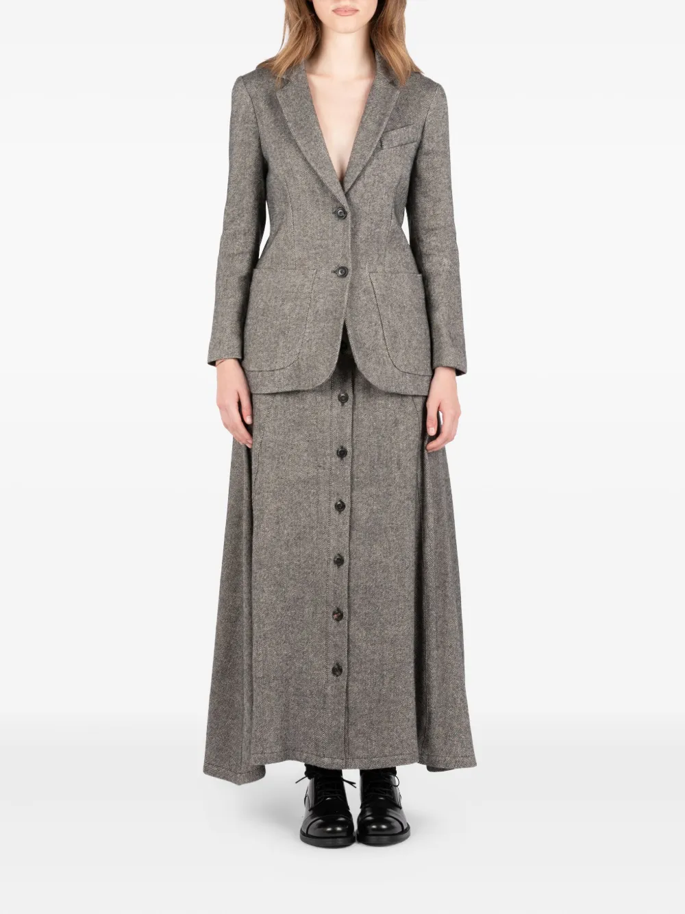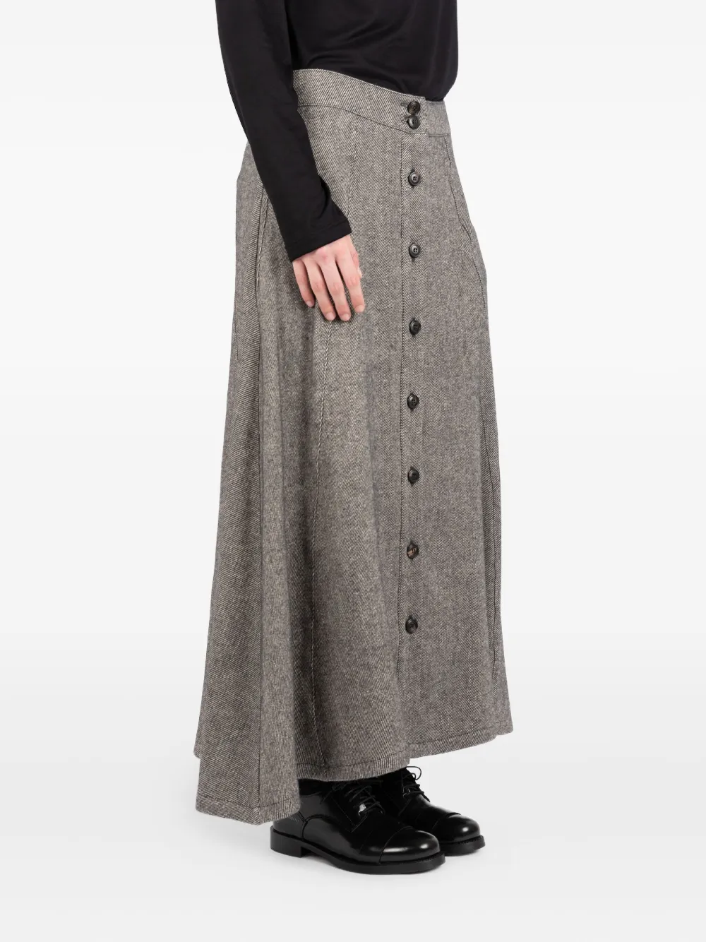Темно-серая застежка на пуговицы, расклешенный подол, боковые карманы А-силуэта