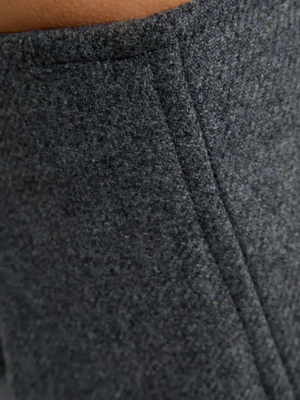 Серая шерстяная ткань, фасон «карандаш», прямой подол, легкая текстура, приталенная талия