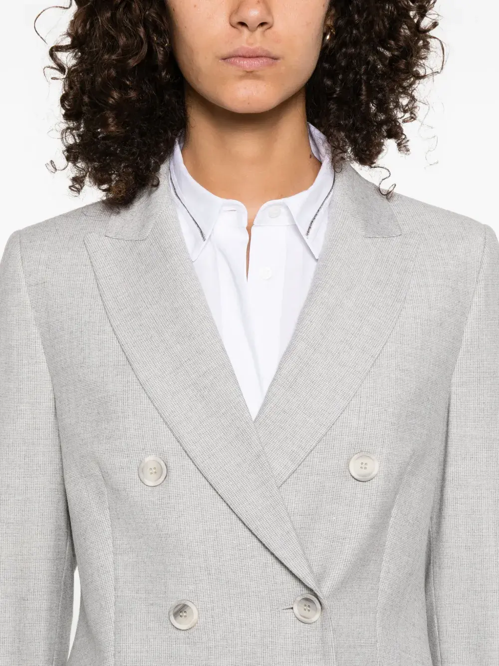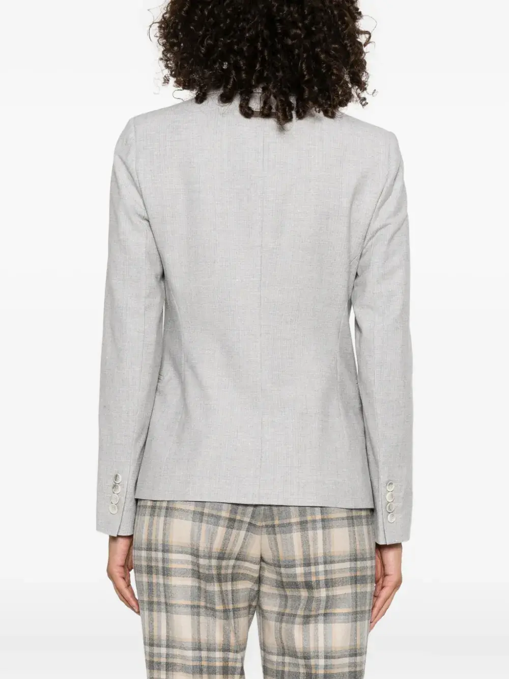 Серый двубортный пиджак с застежкой на пуговицы, остроконечными лацканами, длинными рукавами, прямым подолом