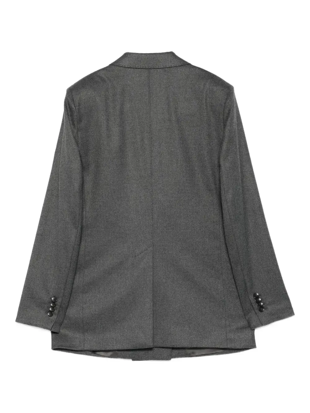 Серый двубортный пиджак с заостренными лацканами, длинными рукавами, застегивающимися на пуговицы манжетами и карманами с клапанами
