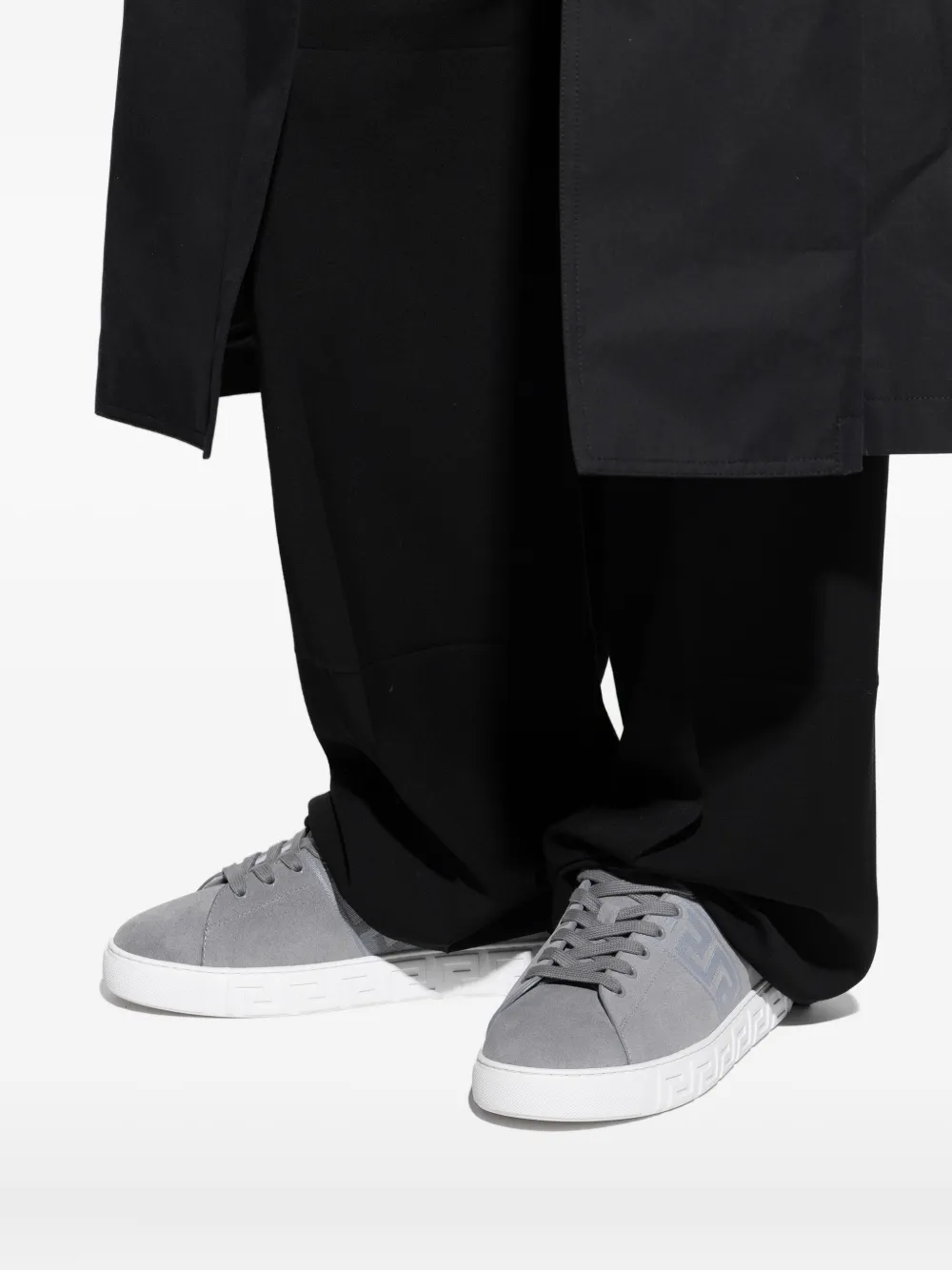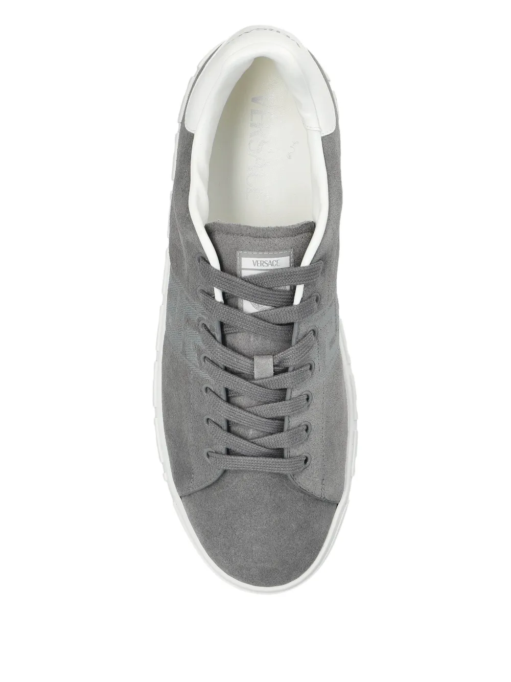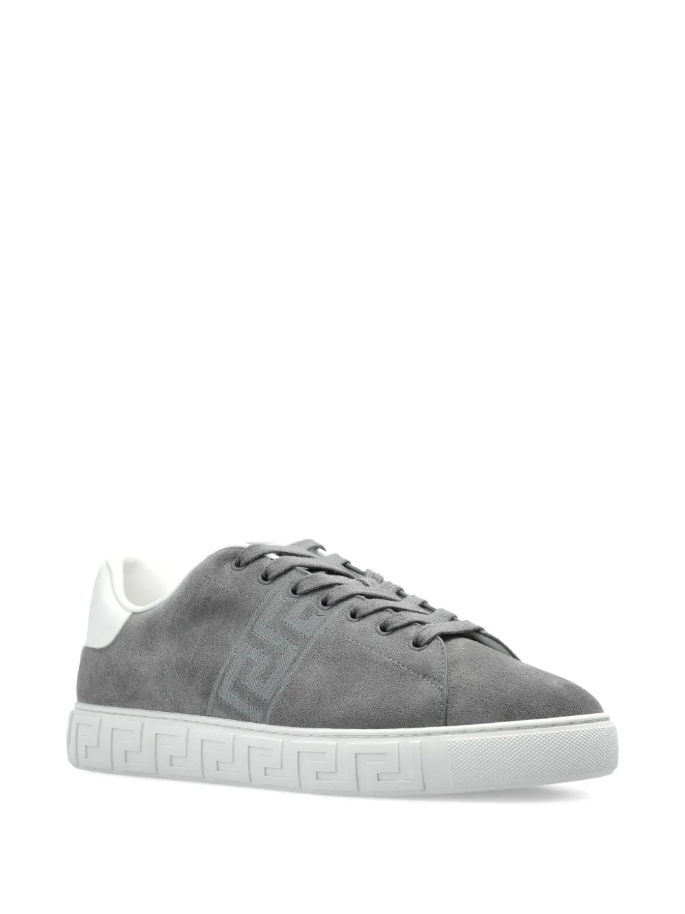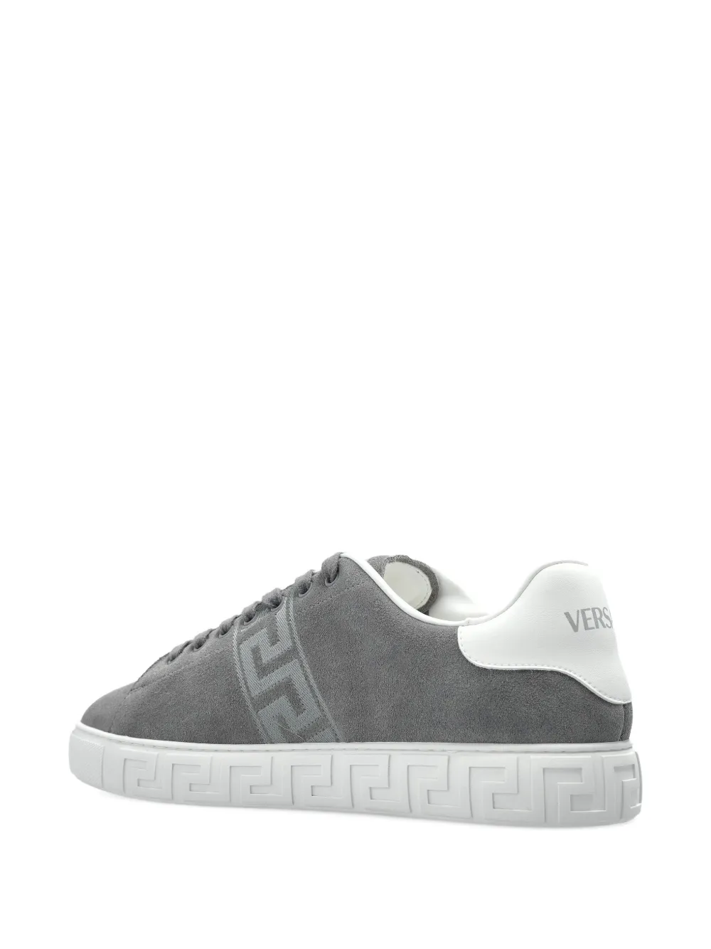 Серая замша, подошва с узором Greca, шнуровка, декоративная деталь Greca на промежуточной подошве, тональная деталь с логотипом