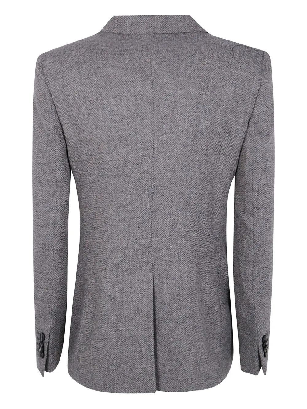 Серо-серебристый двубортный пиджак с узором «елочка», застежка на четыре пуговицы, карманы с клапанами