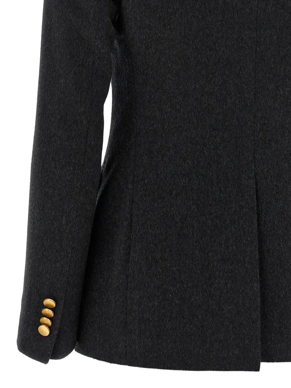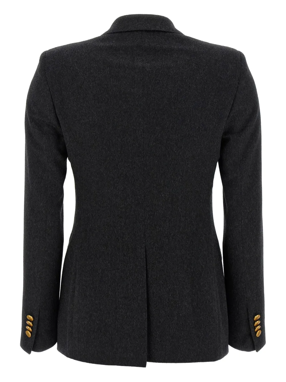 Серый кашемировый двубортный пиджак с заостренными лацканами, карманами с клапанами и шлице сзади.