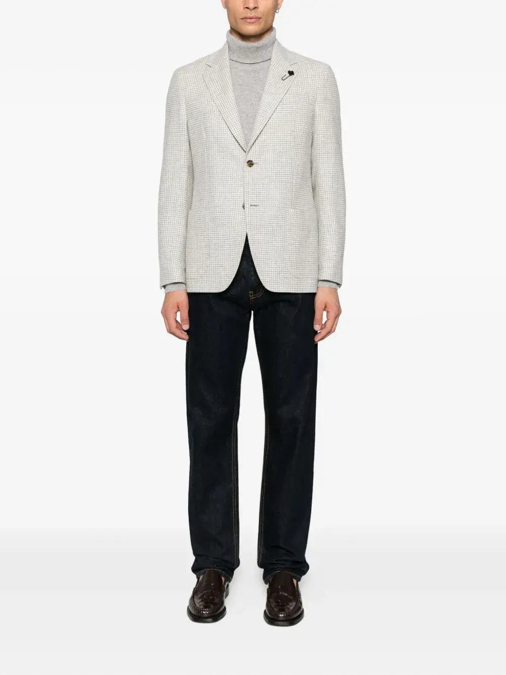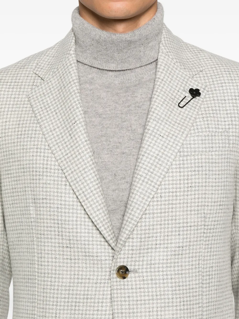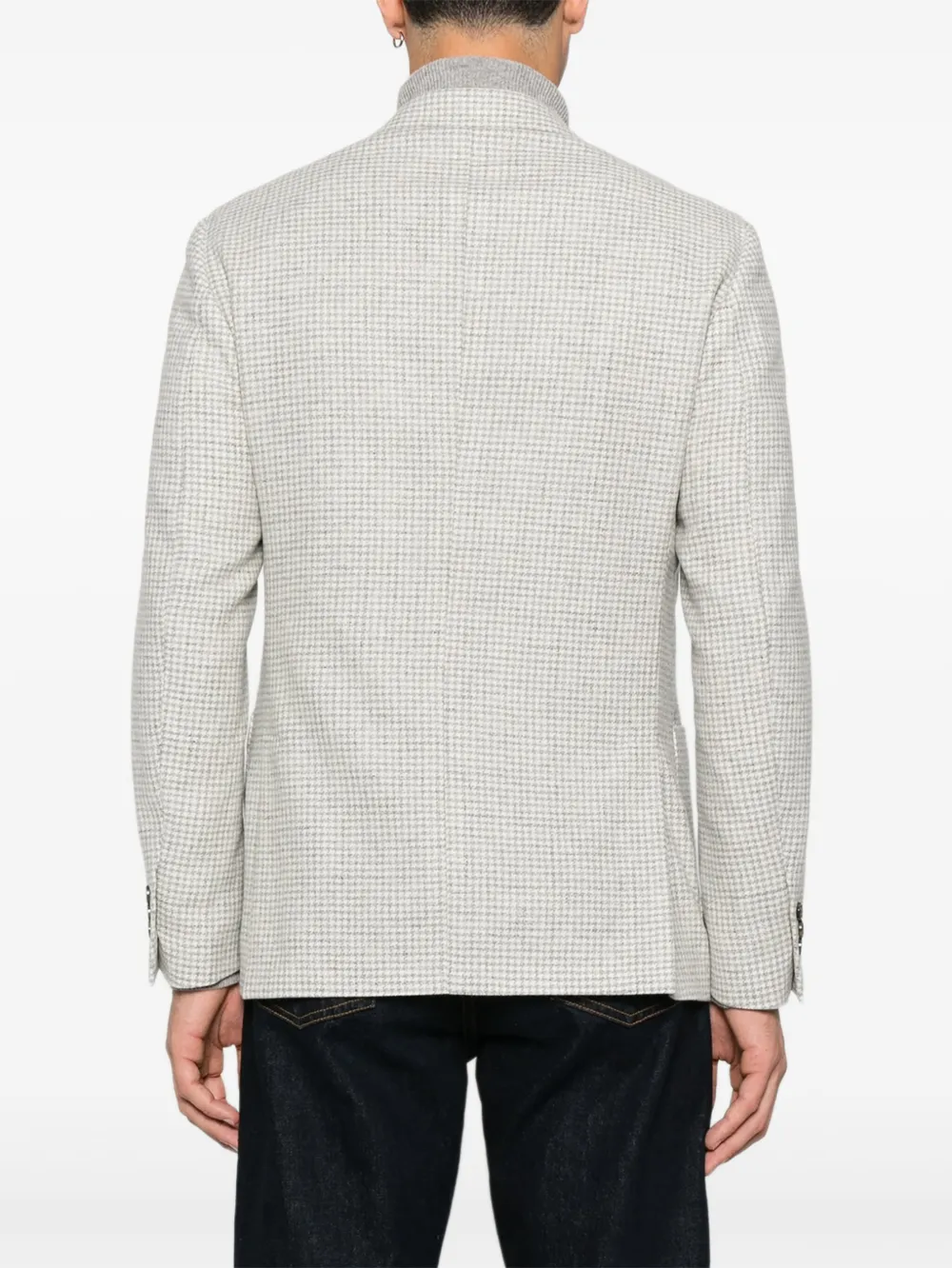 Серый бежевый клетчатый узор, застежка на пуговицы, однобортный, накладные карманы, отложные лацканы, длинные рукава