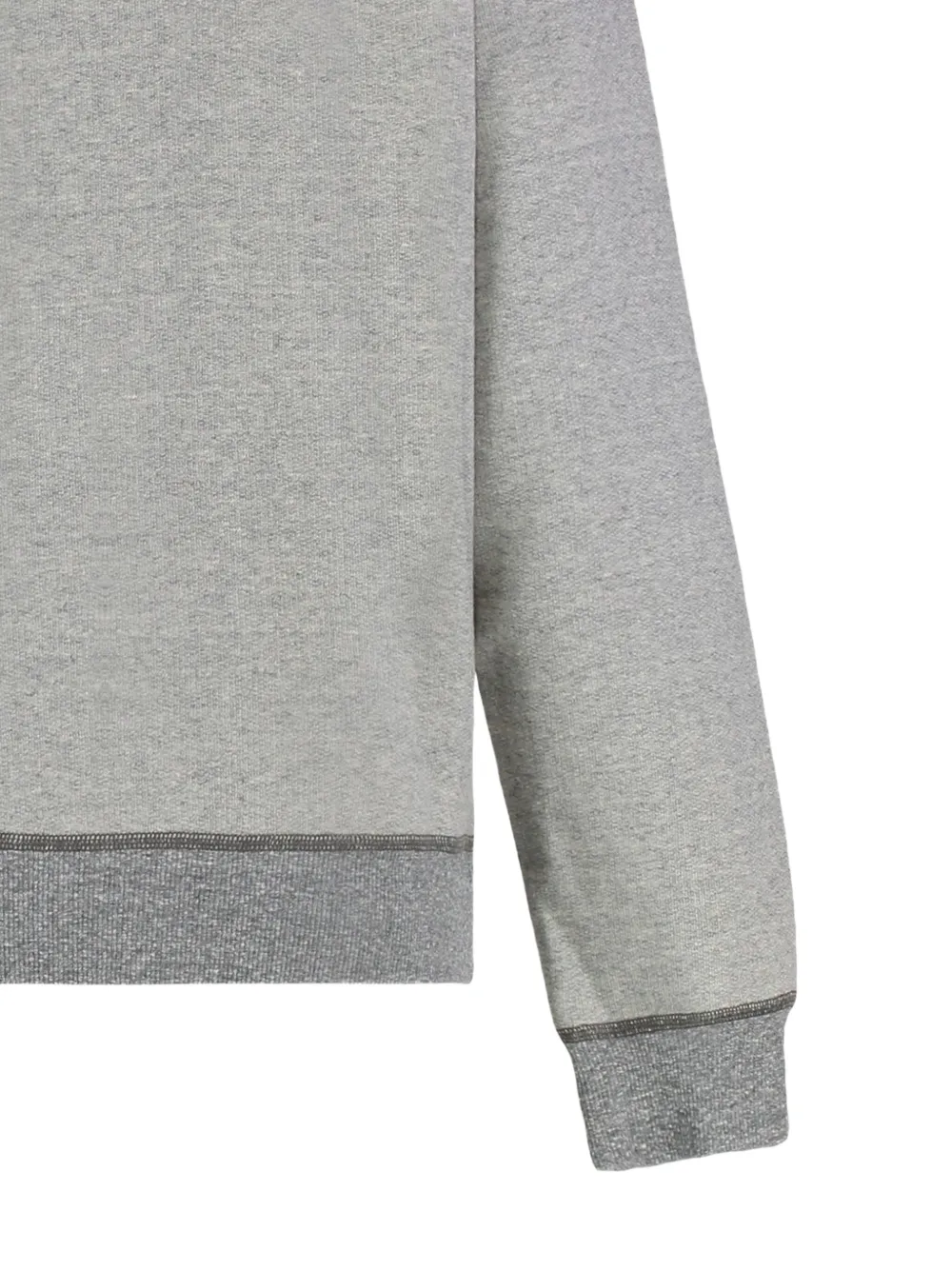 Серые ребристые края, круглый вырез горловины, длинные рукава, вышитый логотип, подол