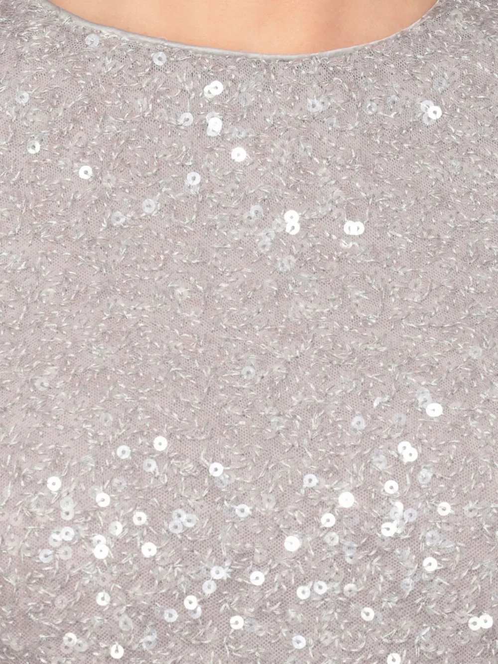 Серые пайетки, длинные рукава, круглый вырез горловины, застежка-молния сзади