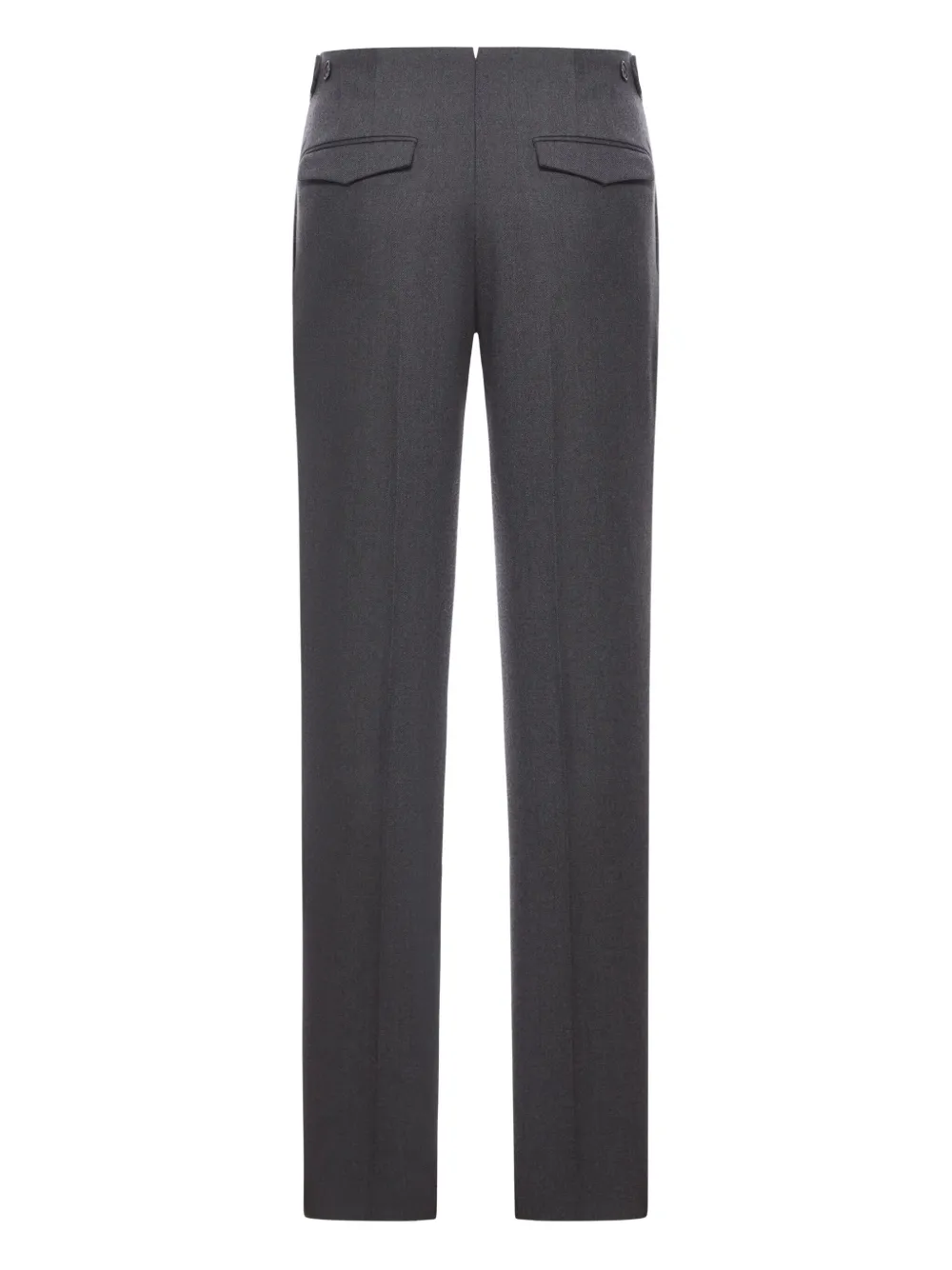 Темно-серая шерсть, плиссировка спереди, застежка на пуговицы, прямой брючины