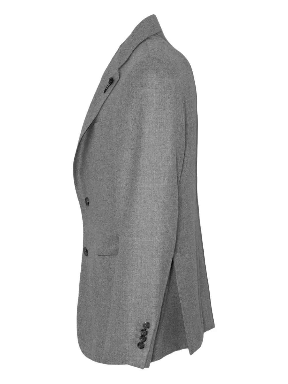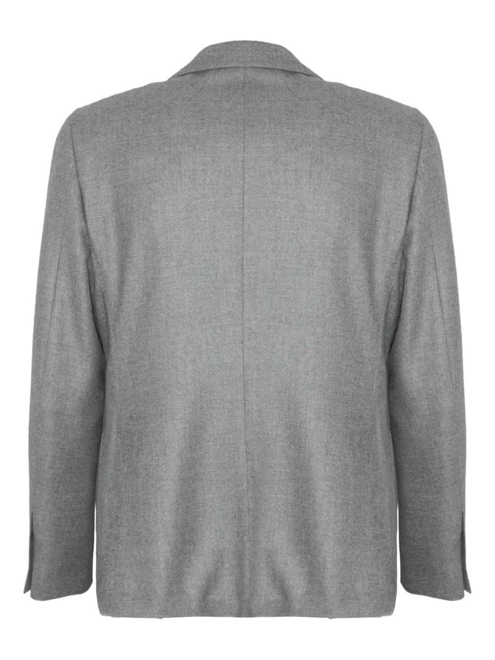 Серая кашемировая ткань, застежка на две пуговицы, два накладных кармана по бокам, нагрудный карман с листочкой, английские шлицы сзади, манжеты на пуговицах
