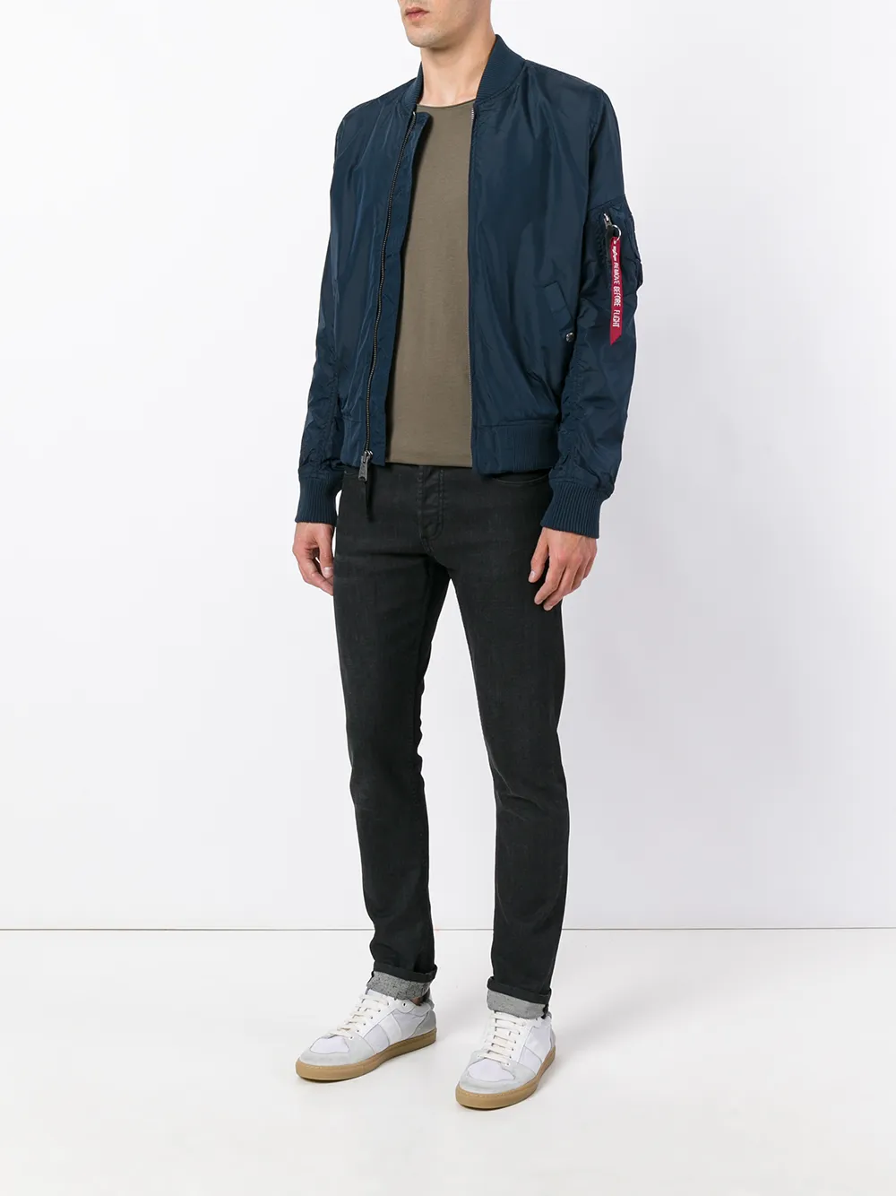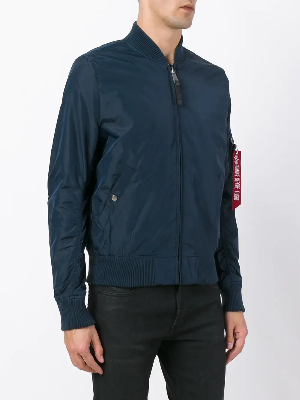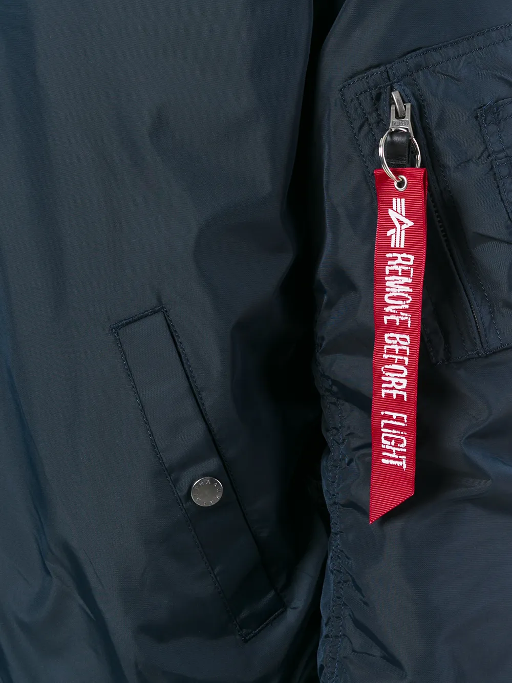 Синяя нейлоновая куртка-бомбер от Alpha Industries. Длинные рукава, вязаные воротник, манжеты и подол, два кармана на кнопках спереди, брелок из ленты с надписью 'Remove Before Flight'.