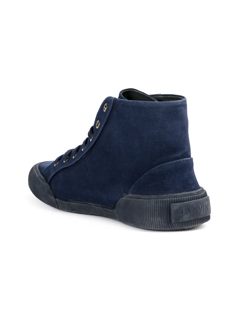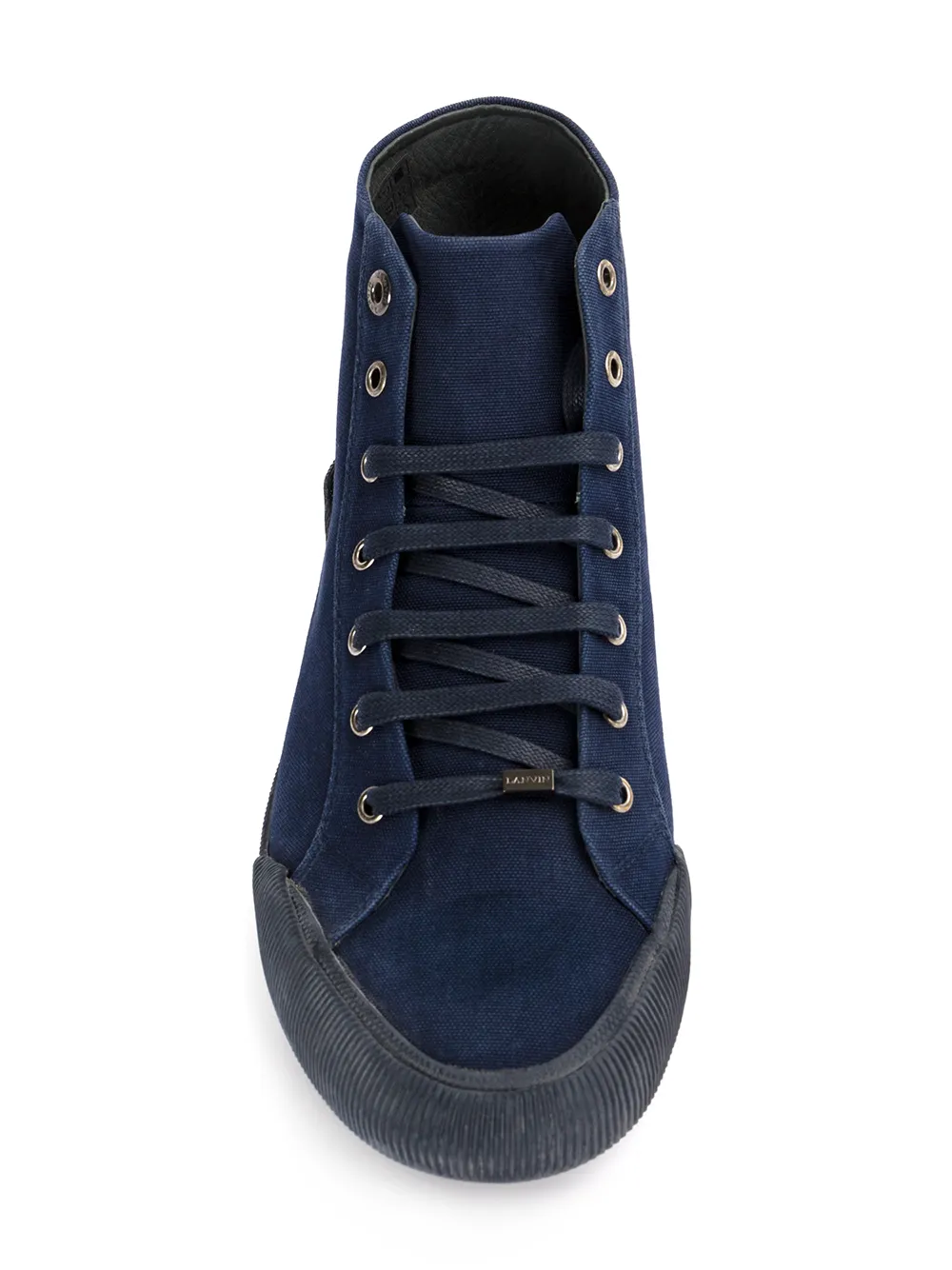 Темно-синие хлопковые холщовые кроссовки от Lanvin(Ланвин). Закругленный носок, передняя шнуровка, плоская резиновая подошва.