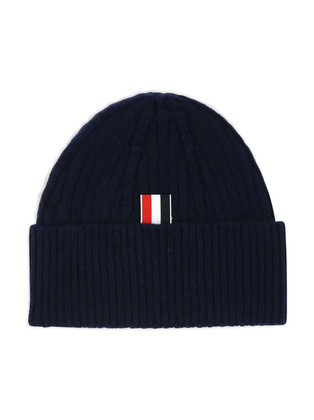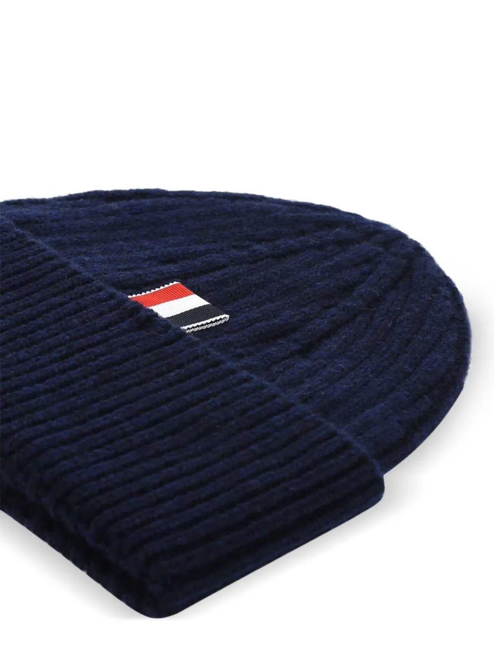 Темно-синяя кашемировая шапка-бини в рубчик от Thom Browne.