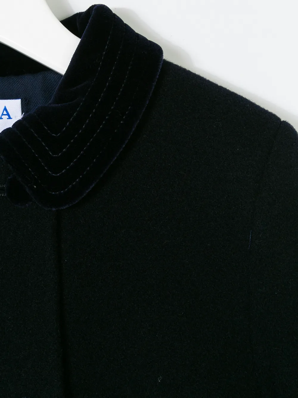 Синее шерстяное пальто А-силуэта на пуговицах от Siola. Двубортный фасон, А-образный силуэт, длинные широкие рукава, передние карманы, декоративная строчка.