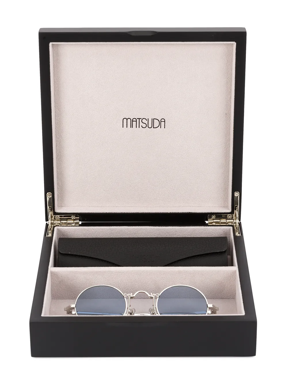 Серебристые солнцезащитные очки в круглой оправе от Matsuda. Прилагается защитный чехол. Модель в стиле унисекс.