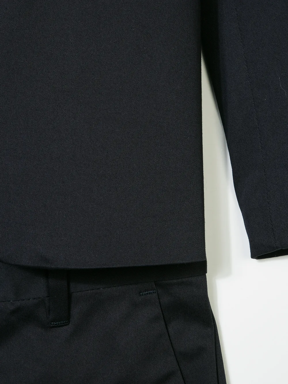 Темно-синий эластичный хлопковый строгий костюм-двойка от Armani Junior(Армани Джуниор). Зазубренные лацканы, длинные рукава, манжеты на пуговицах, нагрудный карман, платок для нагрудного кармана, застежка на пуговицах спереди, прорезные карманы по бокам, двойная шлица сзади.