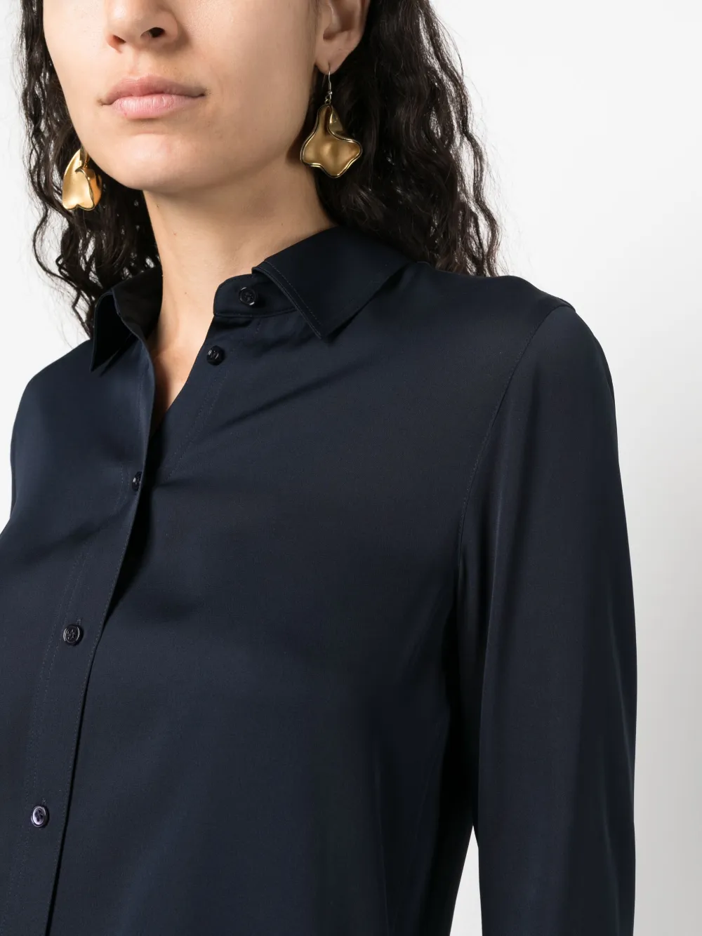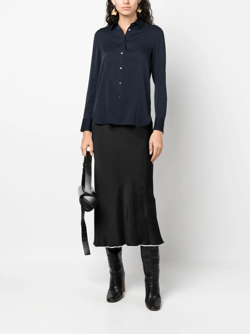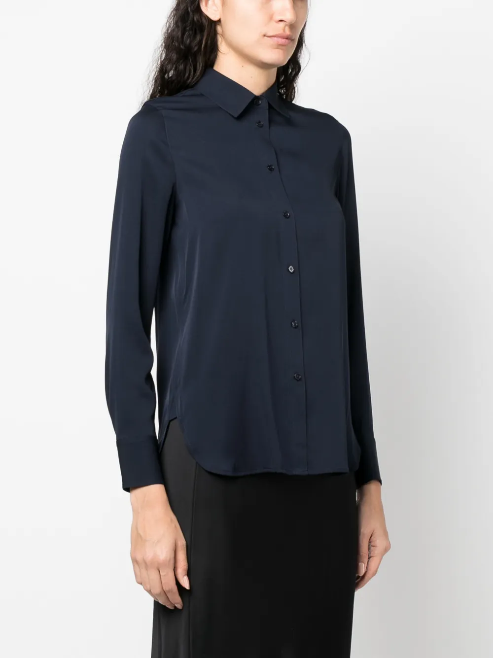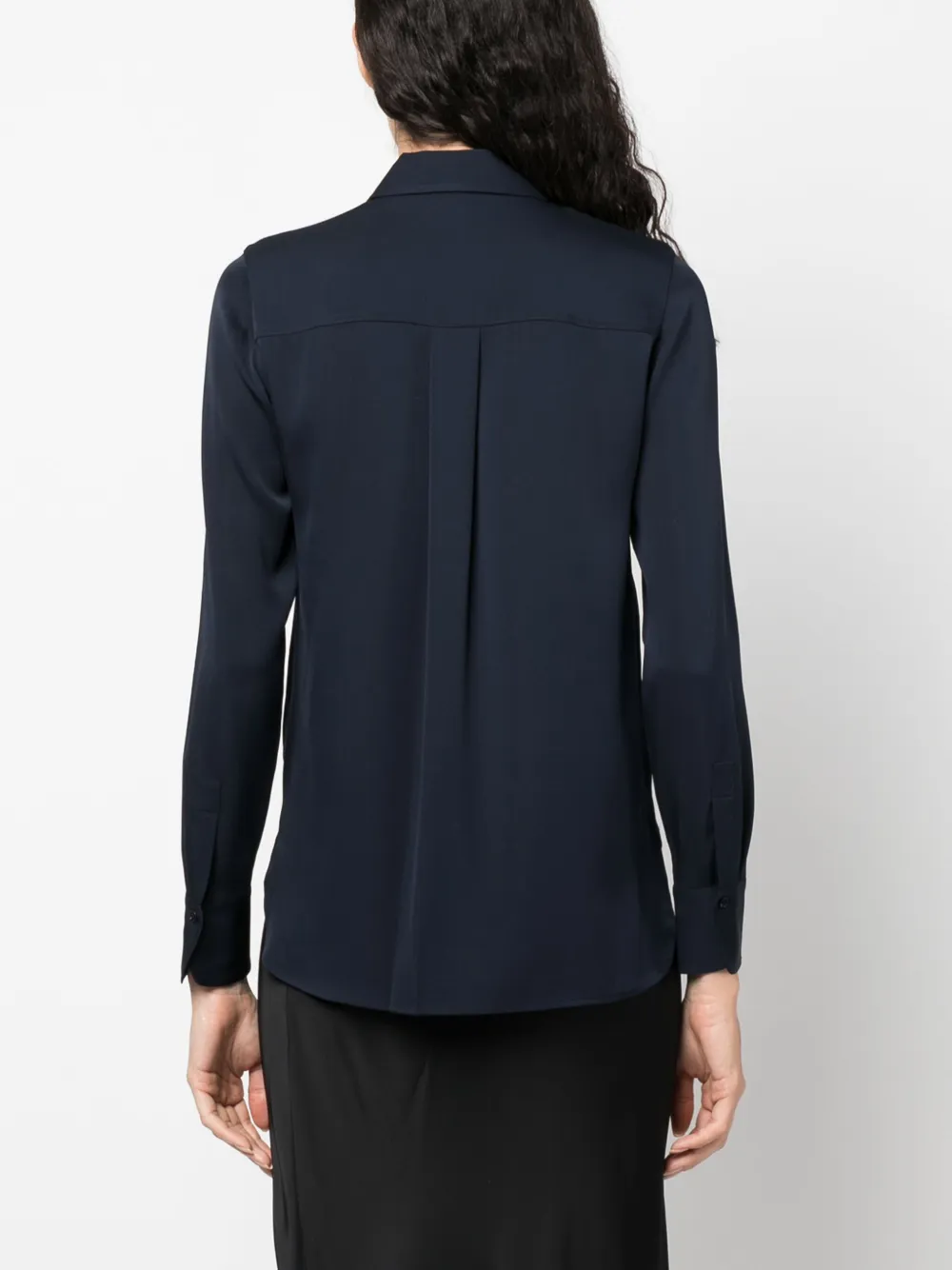 Темно-синяя шелковая классическая рубашка от Vince(Винс). Застежка на пуговицах спереди, классический воротник, длинные рукава, манжеты на пуговицах, свободный силуэт, прямой подол.