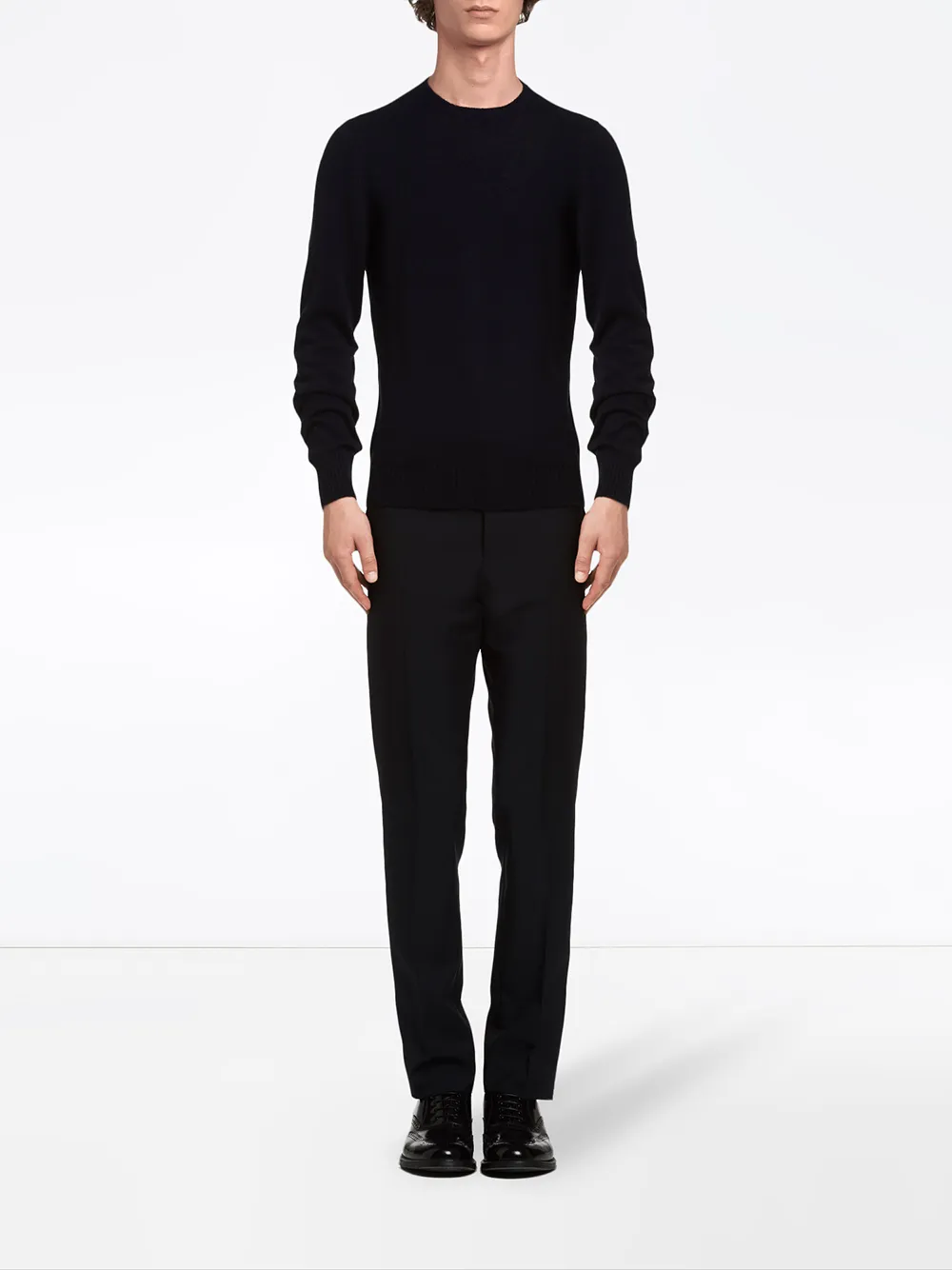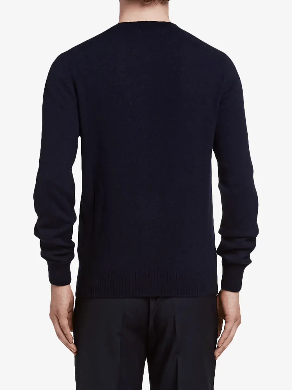 Темно-синий кашемировый свитер с круглым вырезом от Prada. Круглая горловина в рубчик, длинные рукава, узкий крой, подол и манжеты в рубчик.