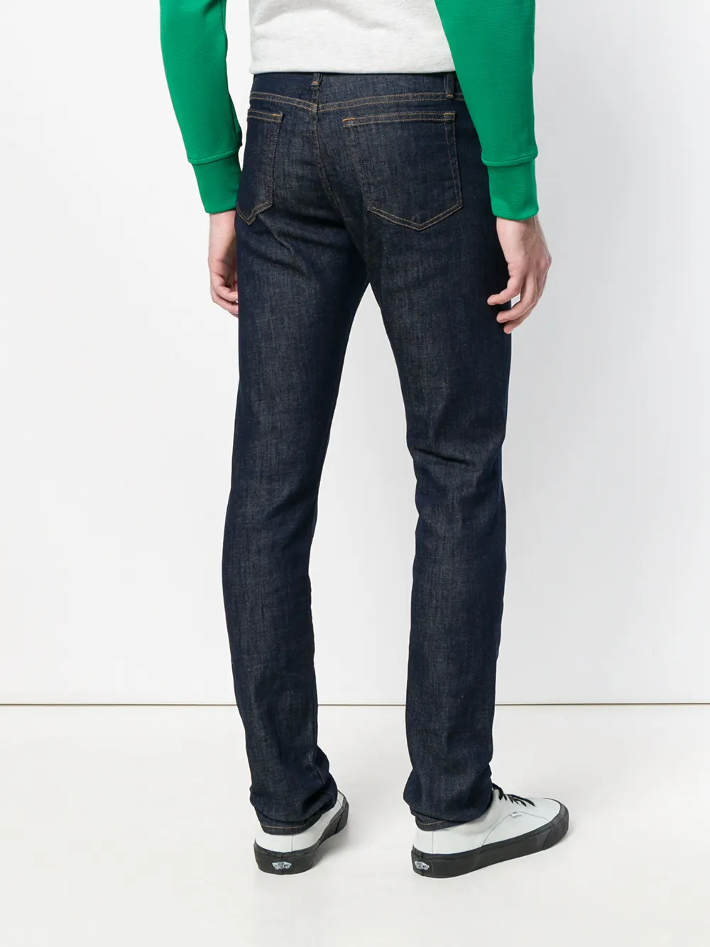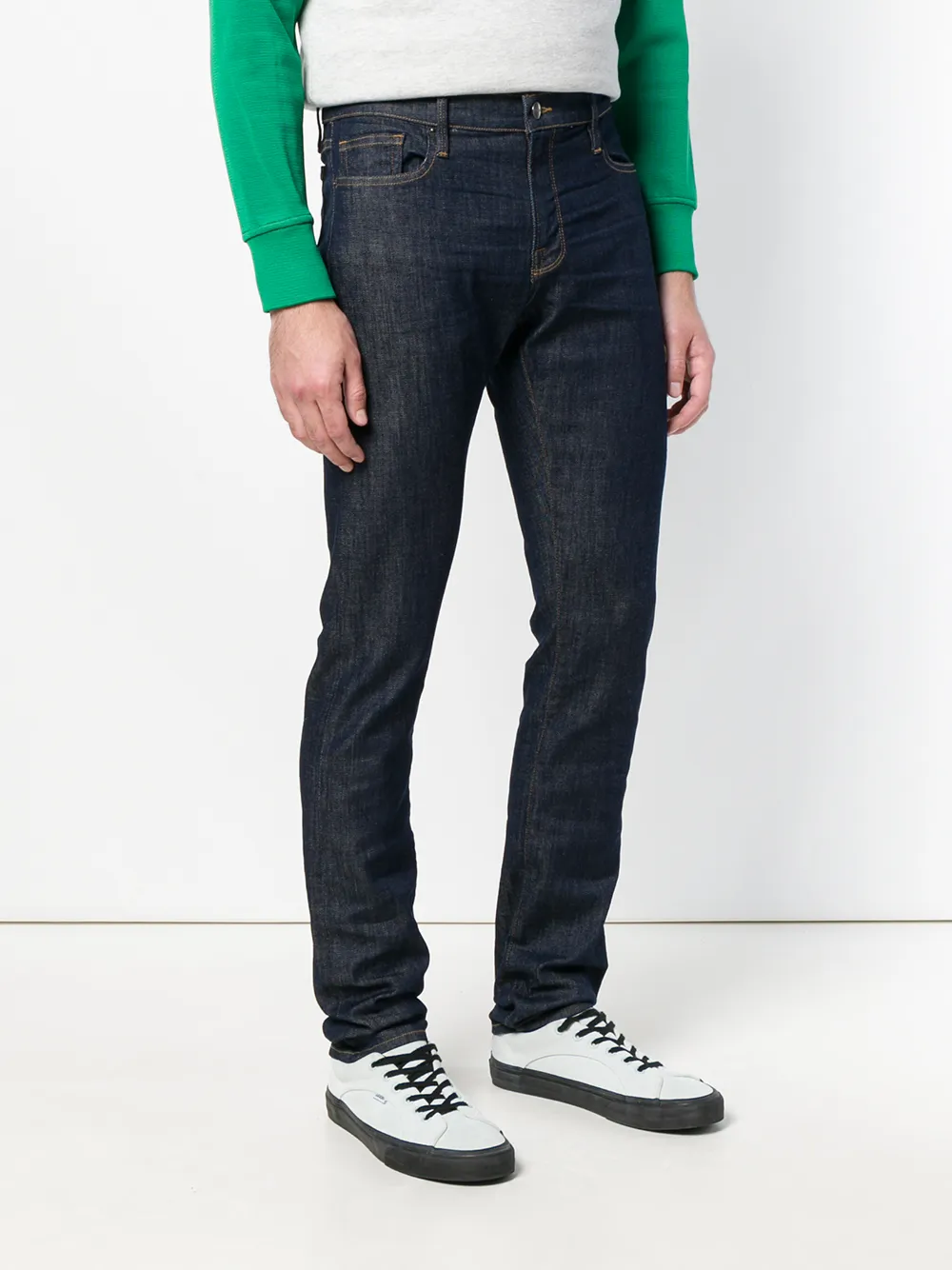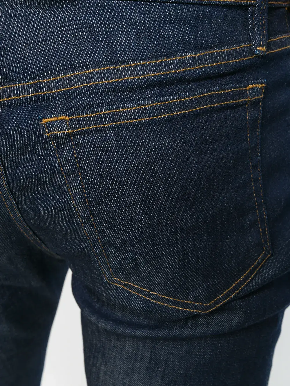 Темно-синие джинсы из хлопкового микса узкого кроя от Frame Denim. Средняя посадка, застежка на пуговице и молнии, классическая пятикарманная модель.