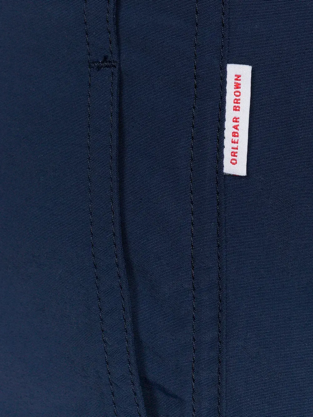 Синие пляжные шорты 'Setter' от Orlebar Brown. Потайная застежка спереди, застежки по бокам на пряжке, боковые карманы. Примерка купальников разрешена только поверх собственного нижнего белья.