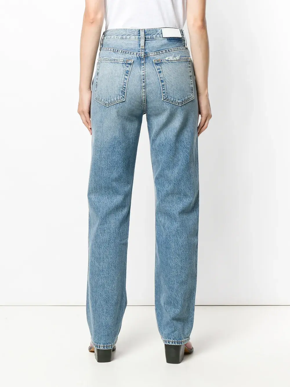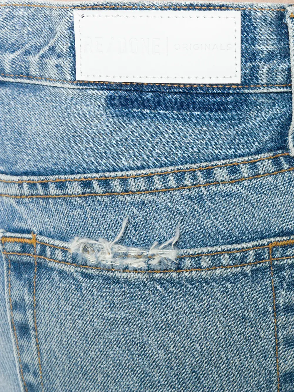 Синие хлопковые прямые джинсы от RE/DONE. Завышенная посадка, пояс с петлями для ремня, застежка на пуговицах спереди, классическая пятикарманная модель, эффект потертости, вставка с логотипом сзади, стандартная длина. Товары марки RE/DONE выполнены из винтажных моделей Levi's, поэтому они могут слегка отличаться от тех, что изображены на фотографии.
