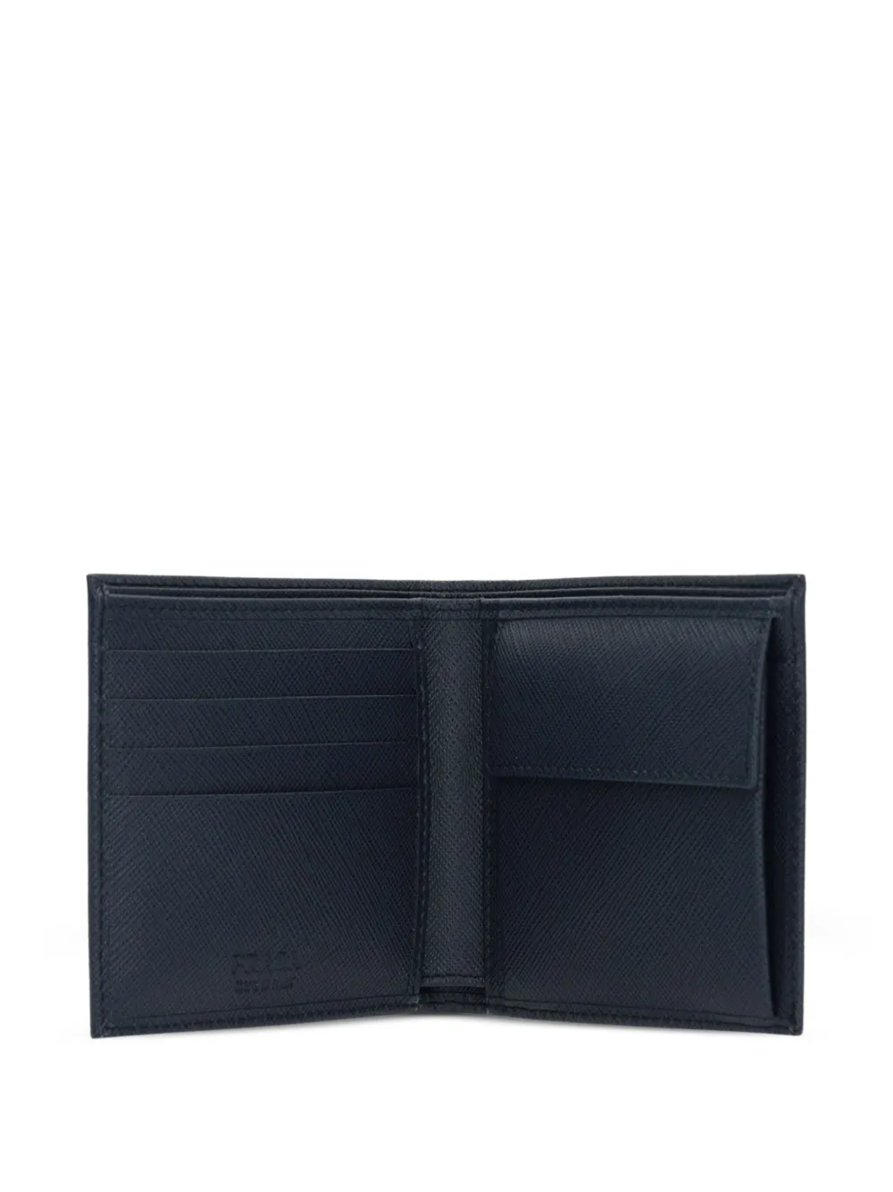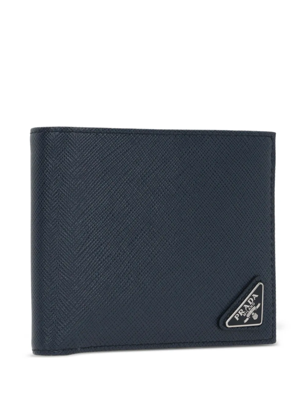 Кошелек из кожи Saffiano от Prada (Прада). Бляшка с логотипом спереди, откидной клапан сверху, несколько отделений для карточек и отделение для купюр. Цвет: синий.