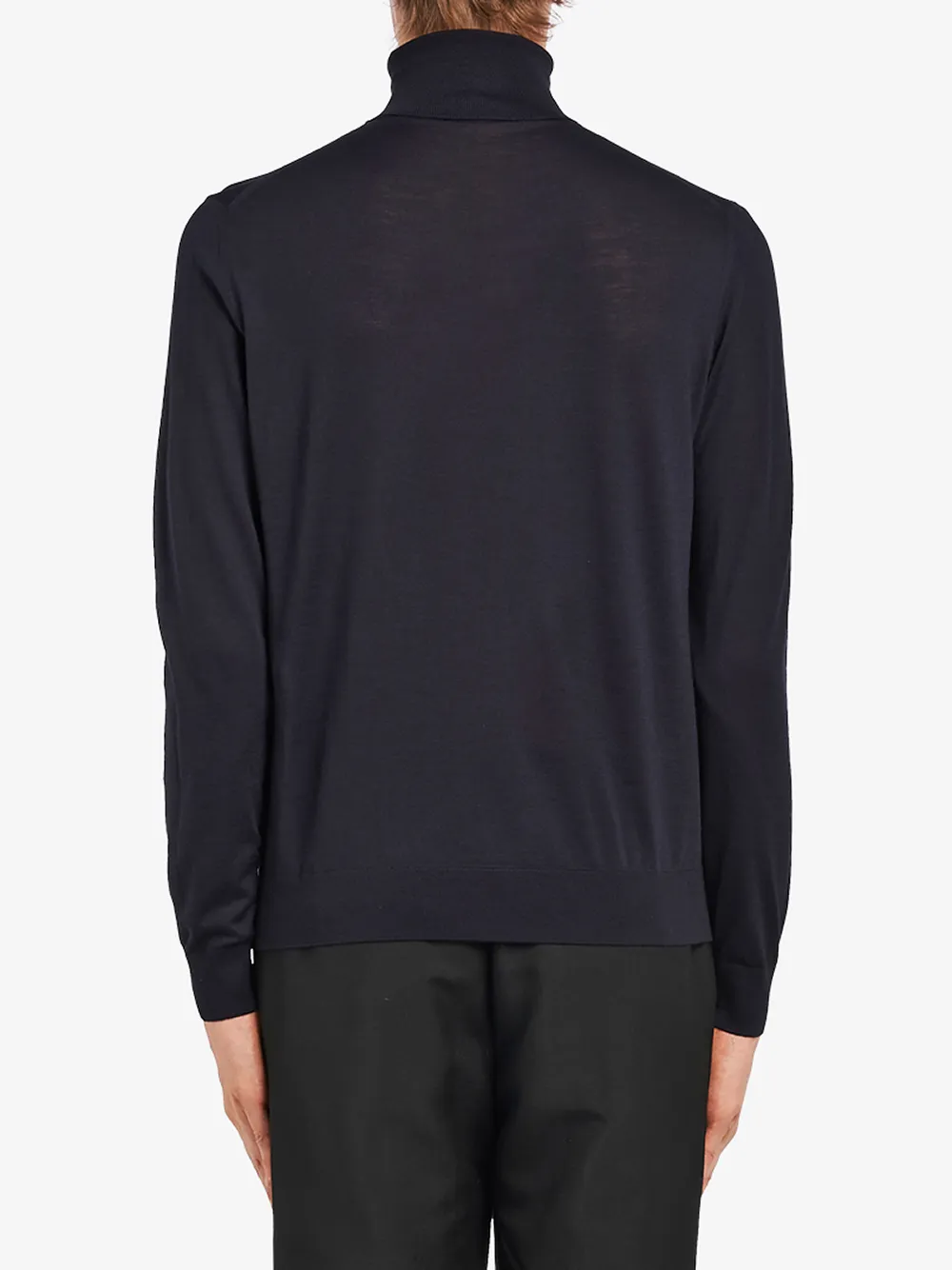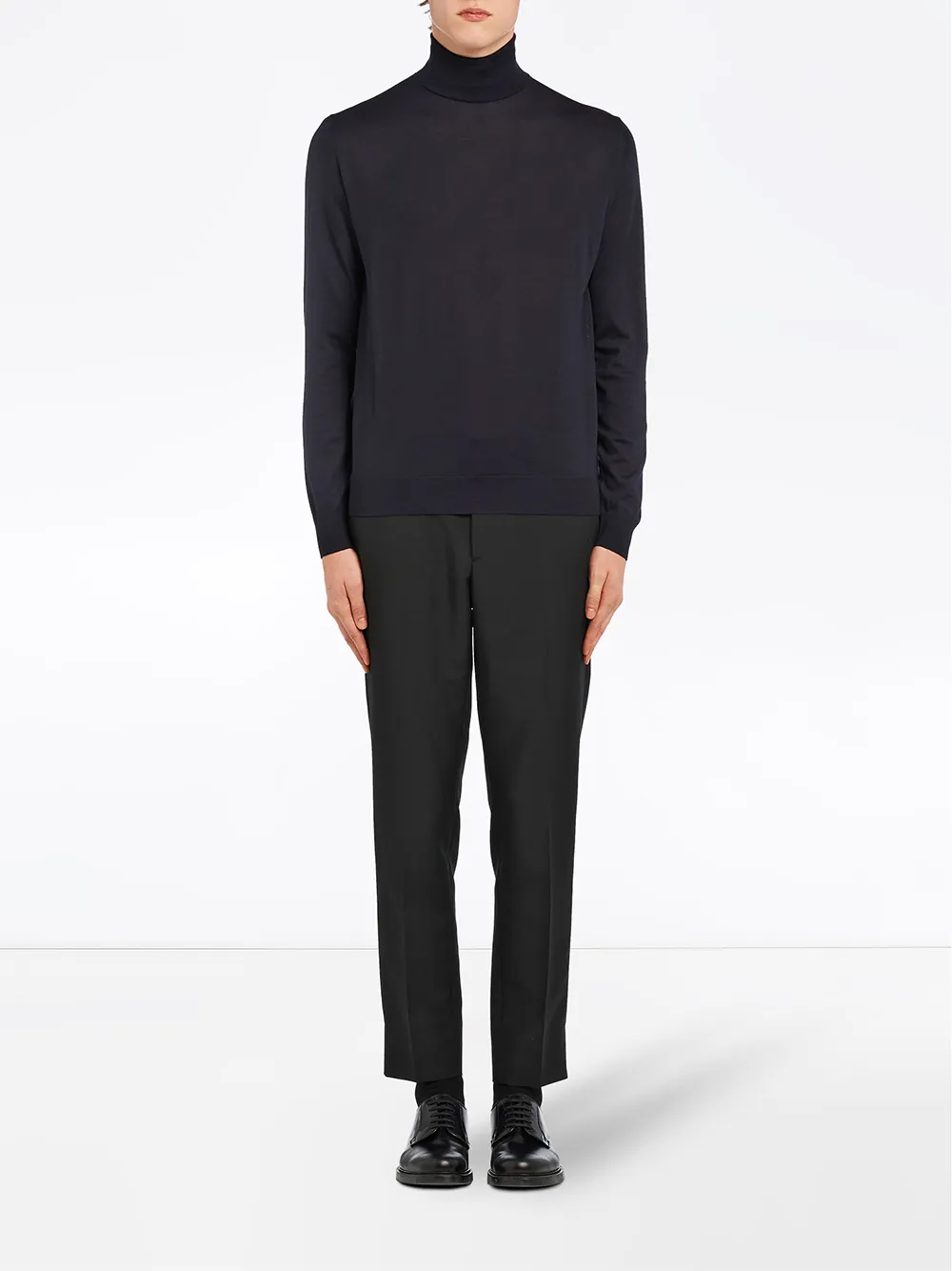 Итальянский модный дом Prada (Прада) каждый сезон представляет в своих коллекция модели превосходного качества и чуждого шаблонности дизайна. Частью коллекции осень-зима 2020 стал темно-синий свитер с высоким воротником из чистой шерсти. Он имеет длинные рукава и прямой подол.