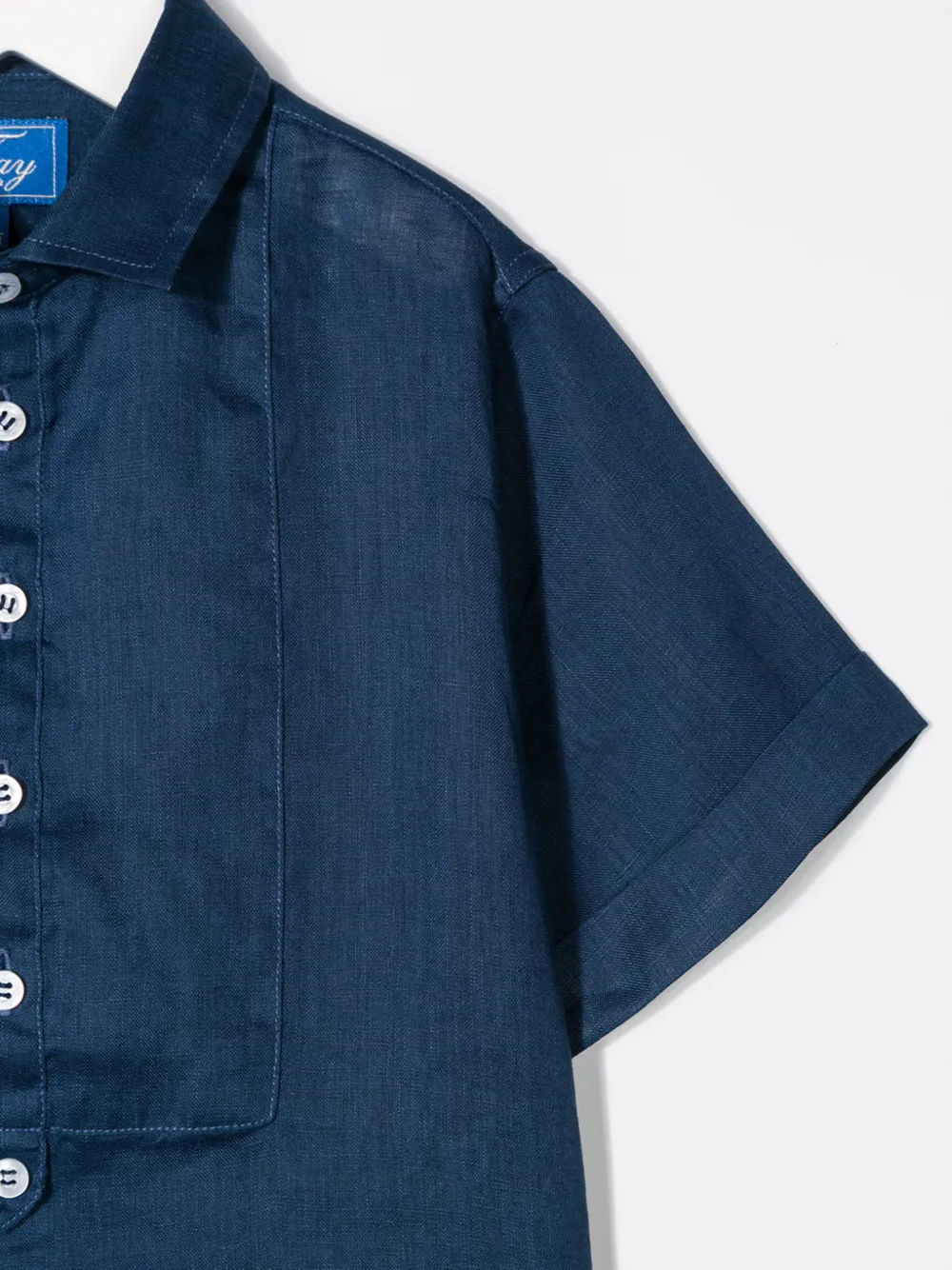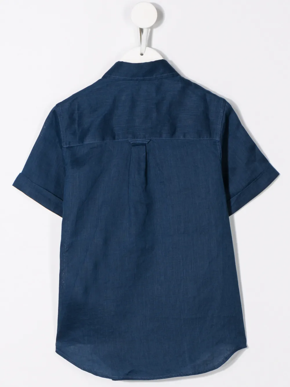 Джинсовая рубашка-поло от Fay Kids. Косой воротник, планка на пуговицах спереди, закругленный подол, вышитый логотип спереди, нагрудник на шее и короткие рукава.