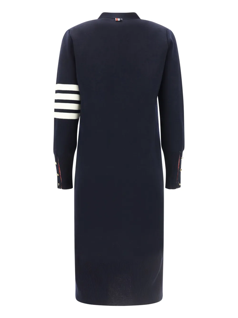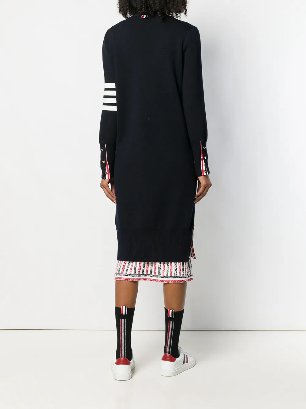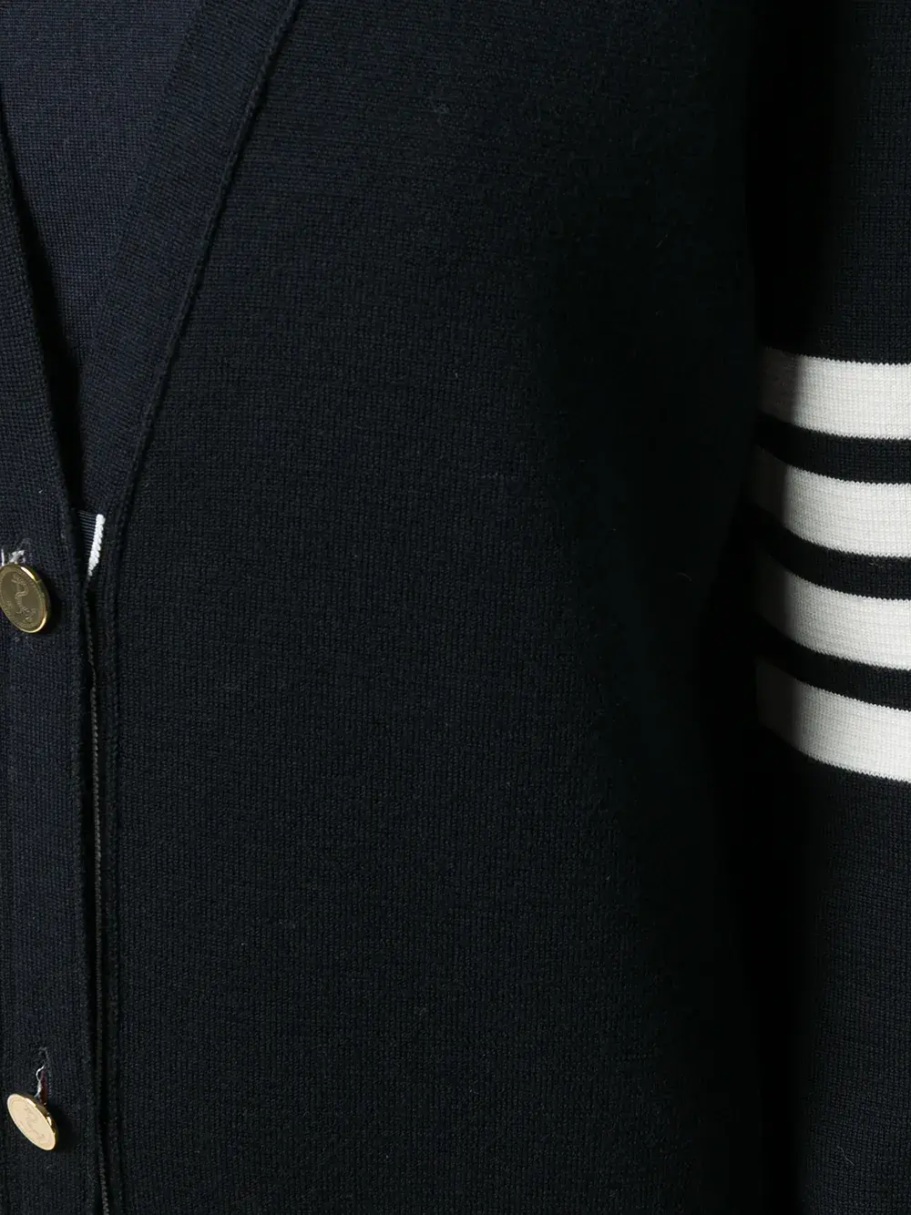 V-образный вырез, фирменная деталь в полоску, застежка на пуговицах спереди, полоски 4-Bar и длинные рукава.