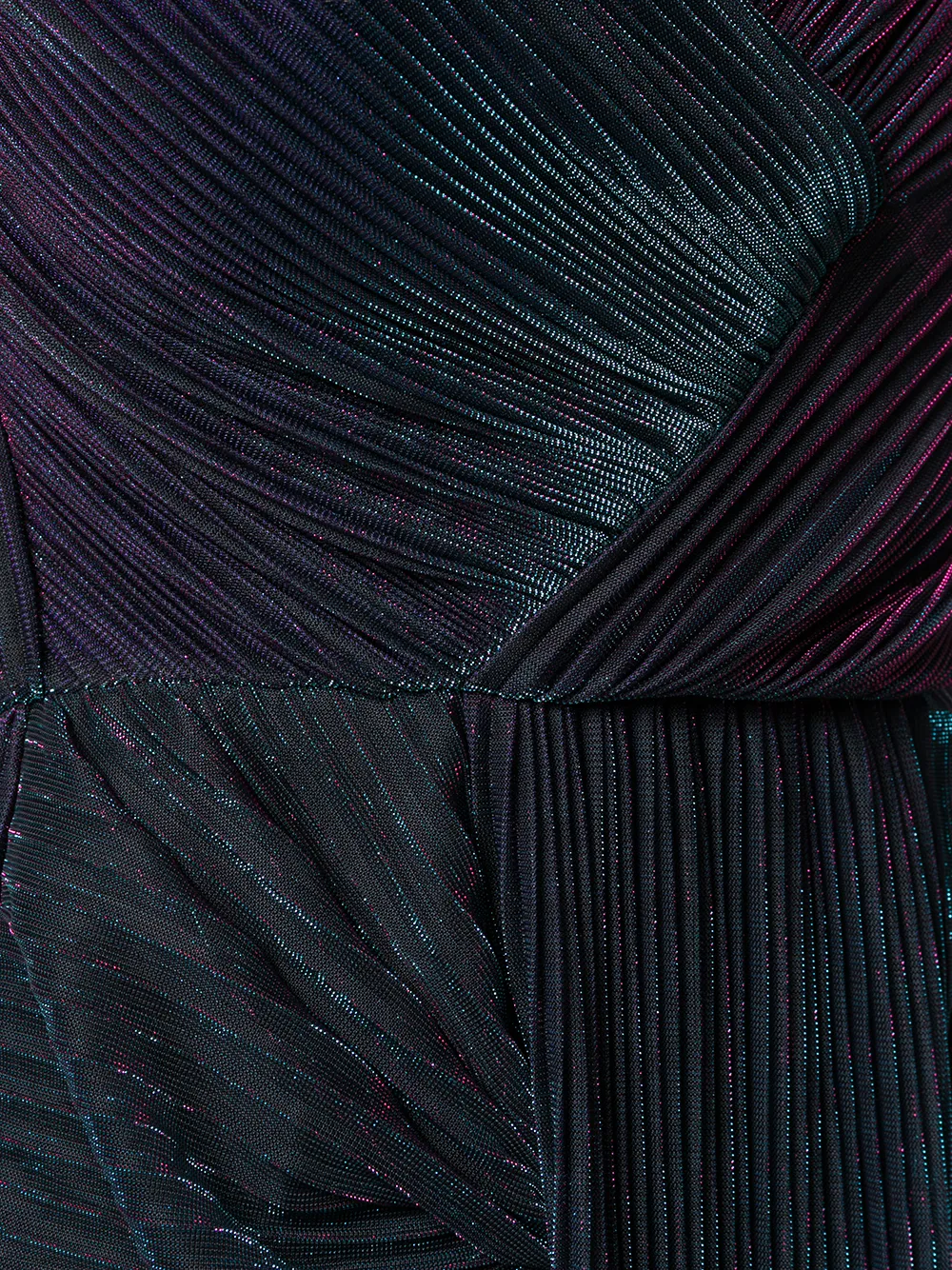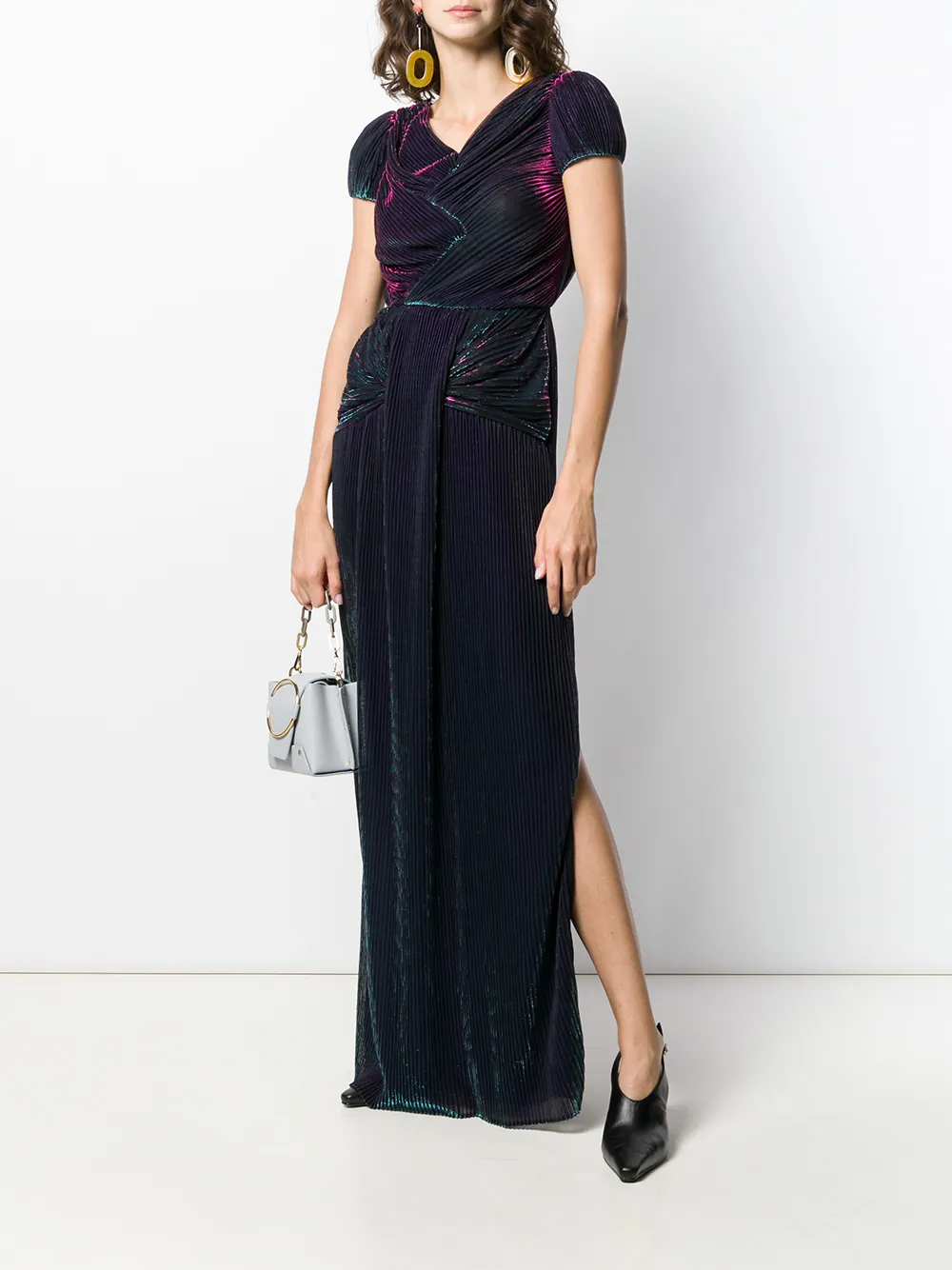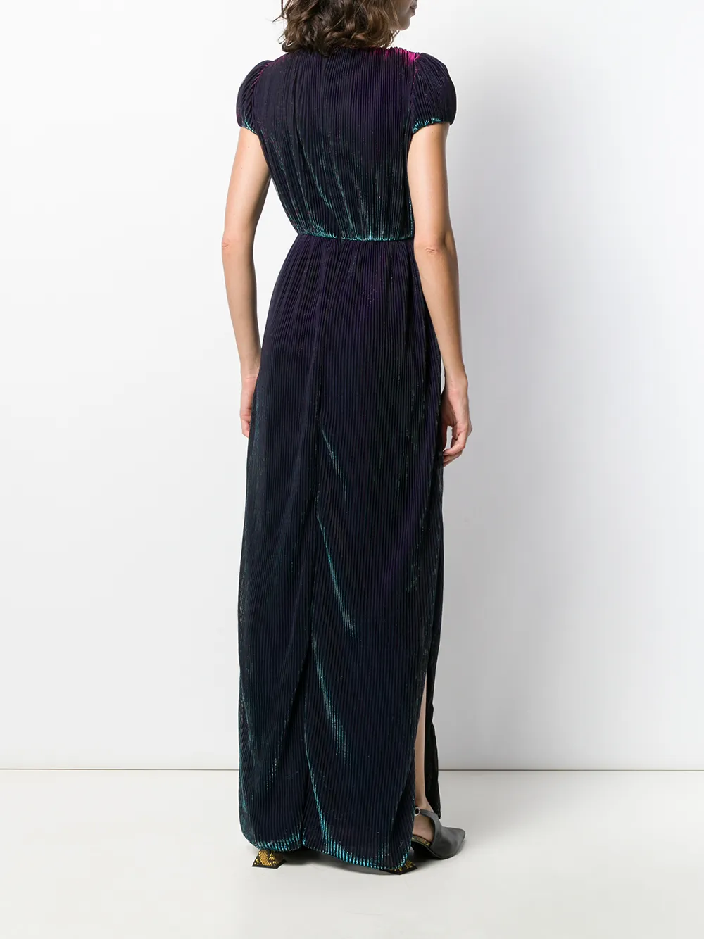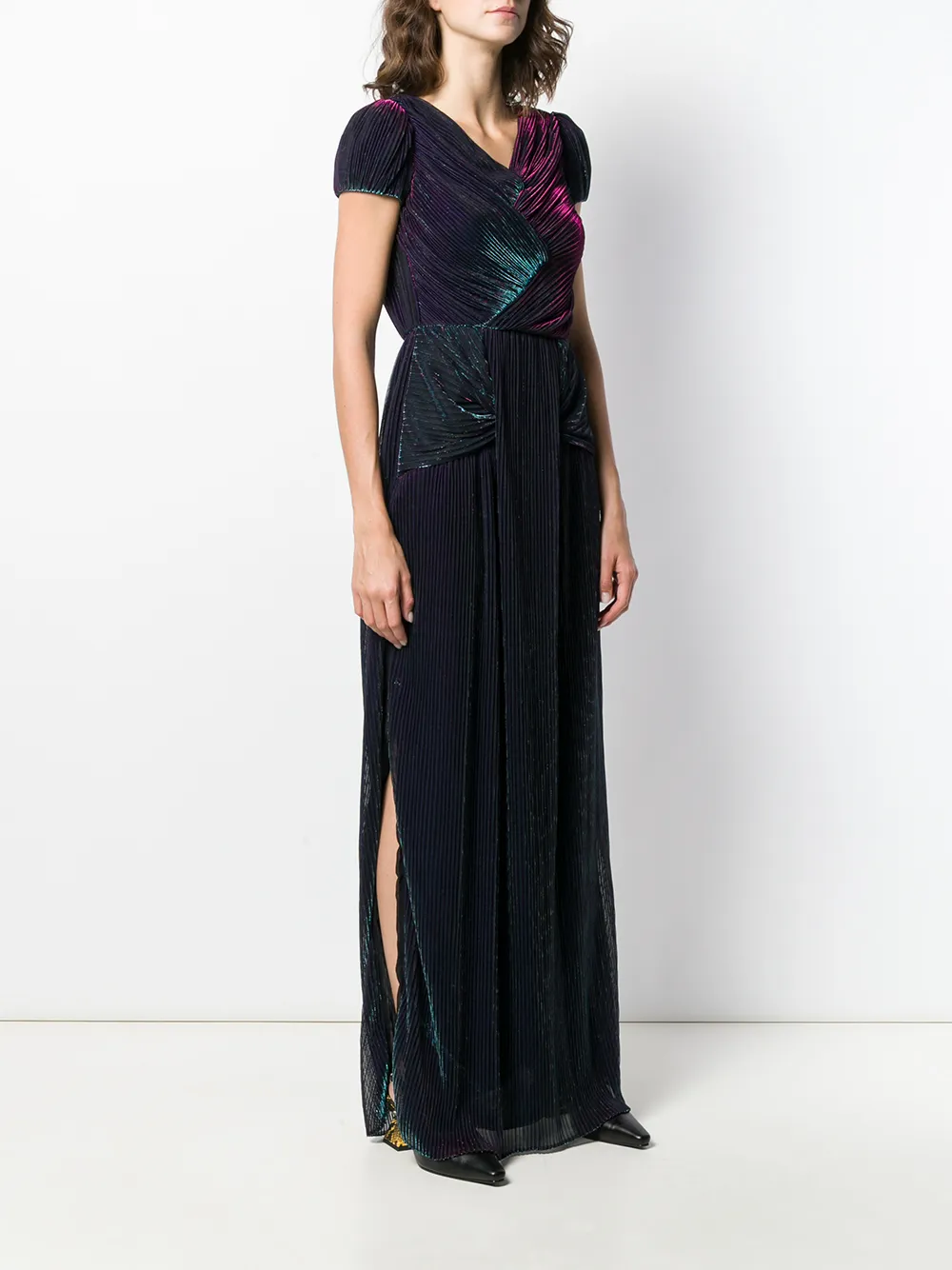 Плиссированное платье с эффектом металлик от Marco De Vincenzo. Короткие рукава, V-образная горловина, плиссированный дизайн, разрезы по бокам и металлический отблеск.