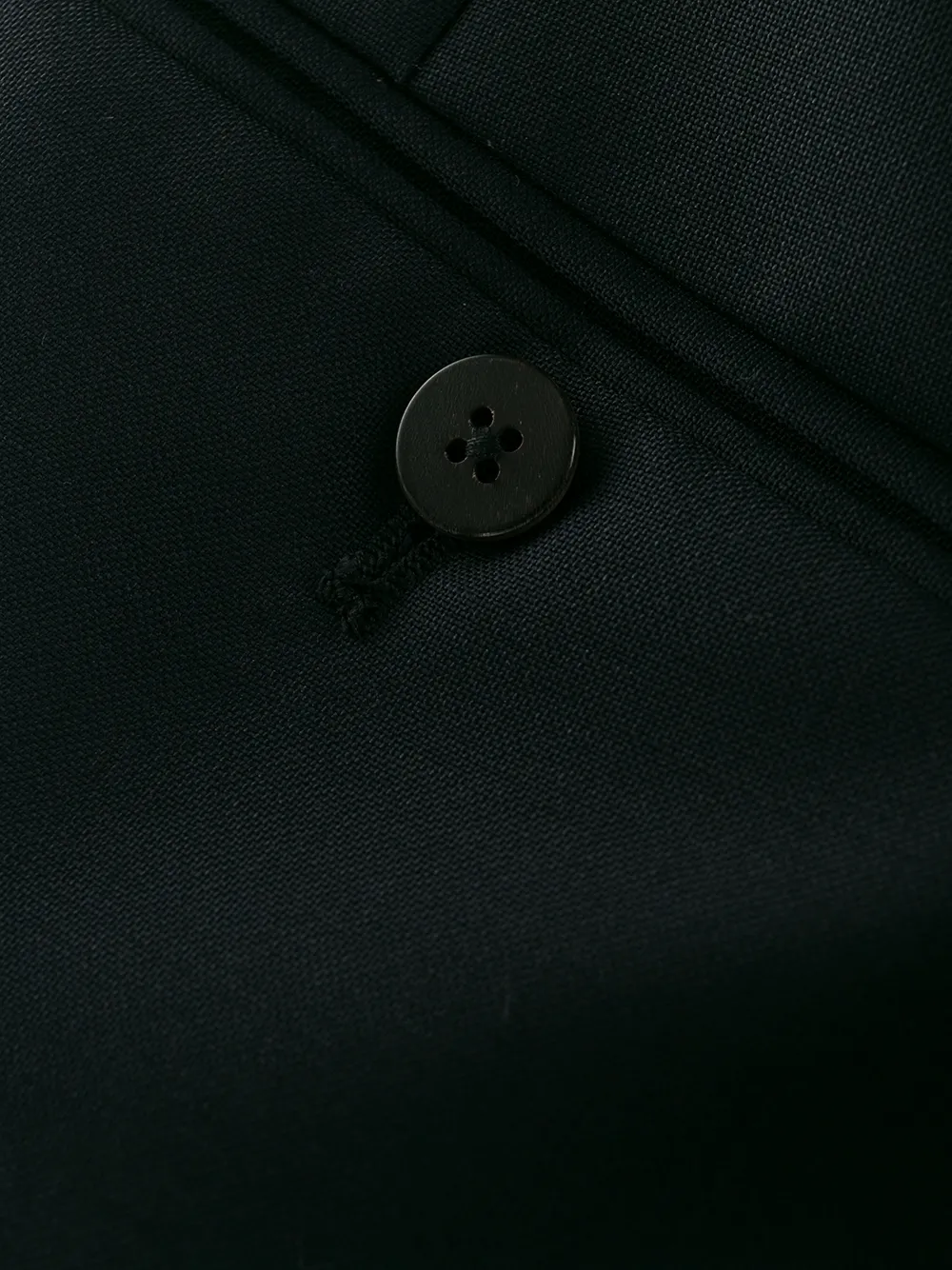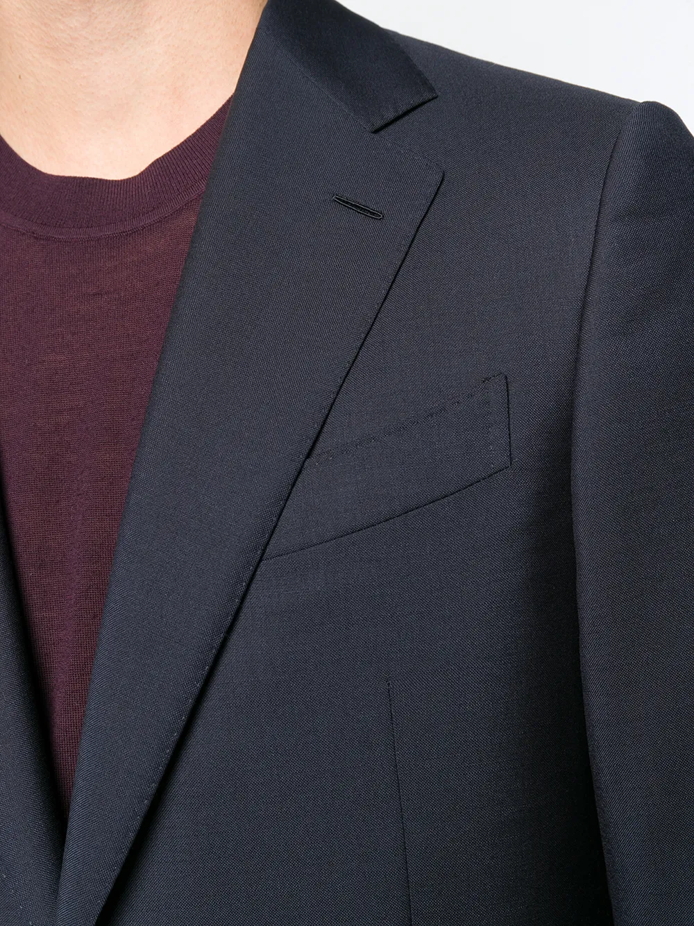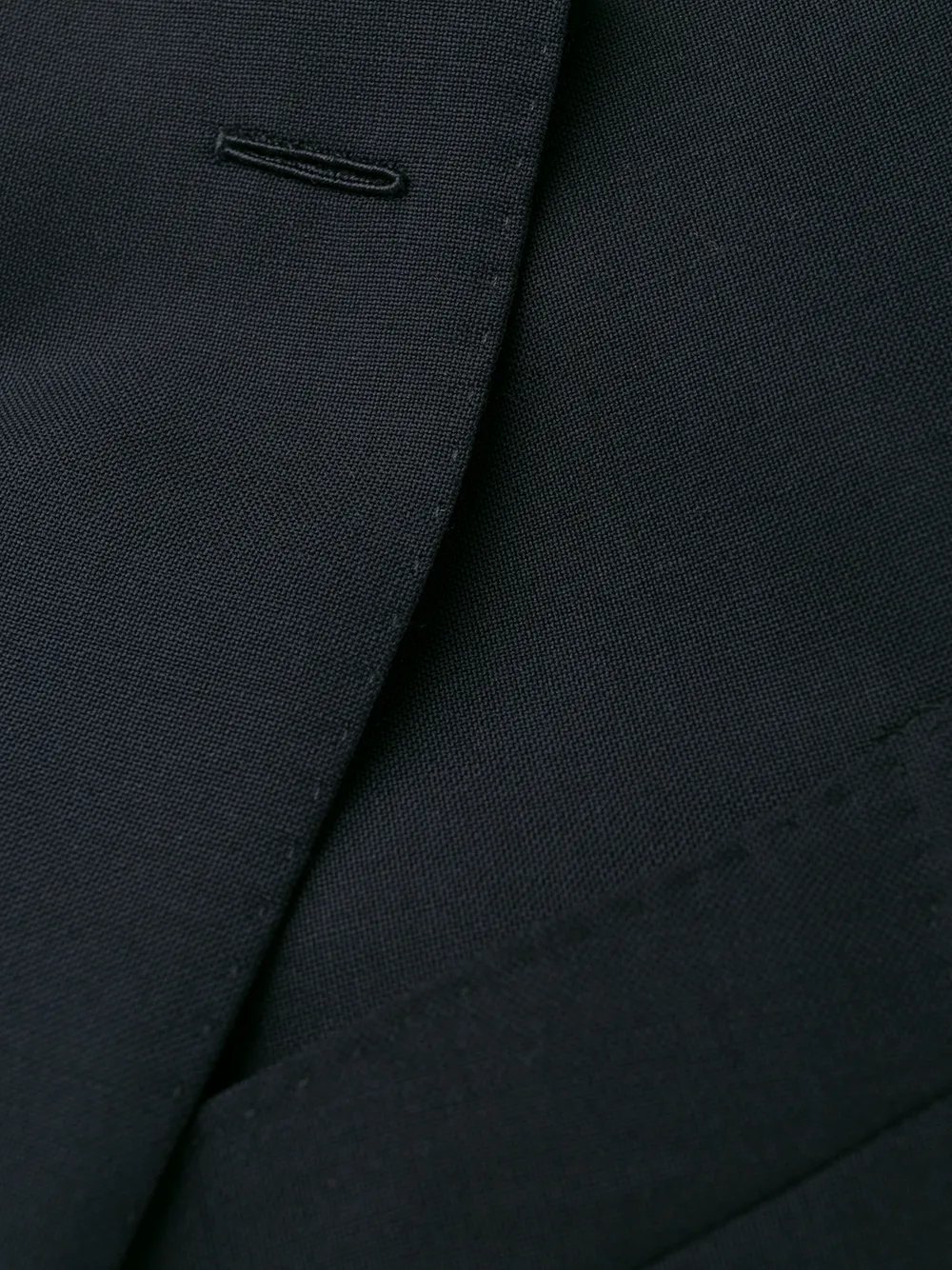 Костюм-двойка узкого кроя от Caruso. Длинные рукава, зазубренный воротник, застежка на пуговицах спереди, широкий карман с листочкой на груди, передний карман с листочкой и узкий крой.