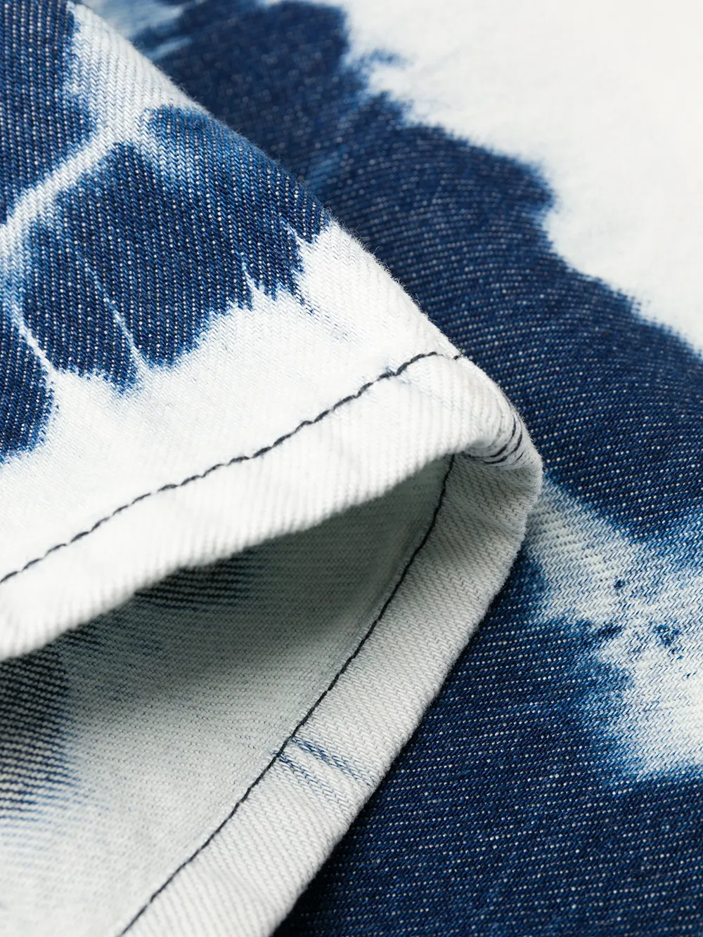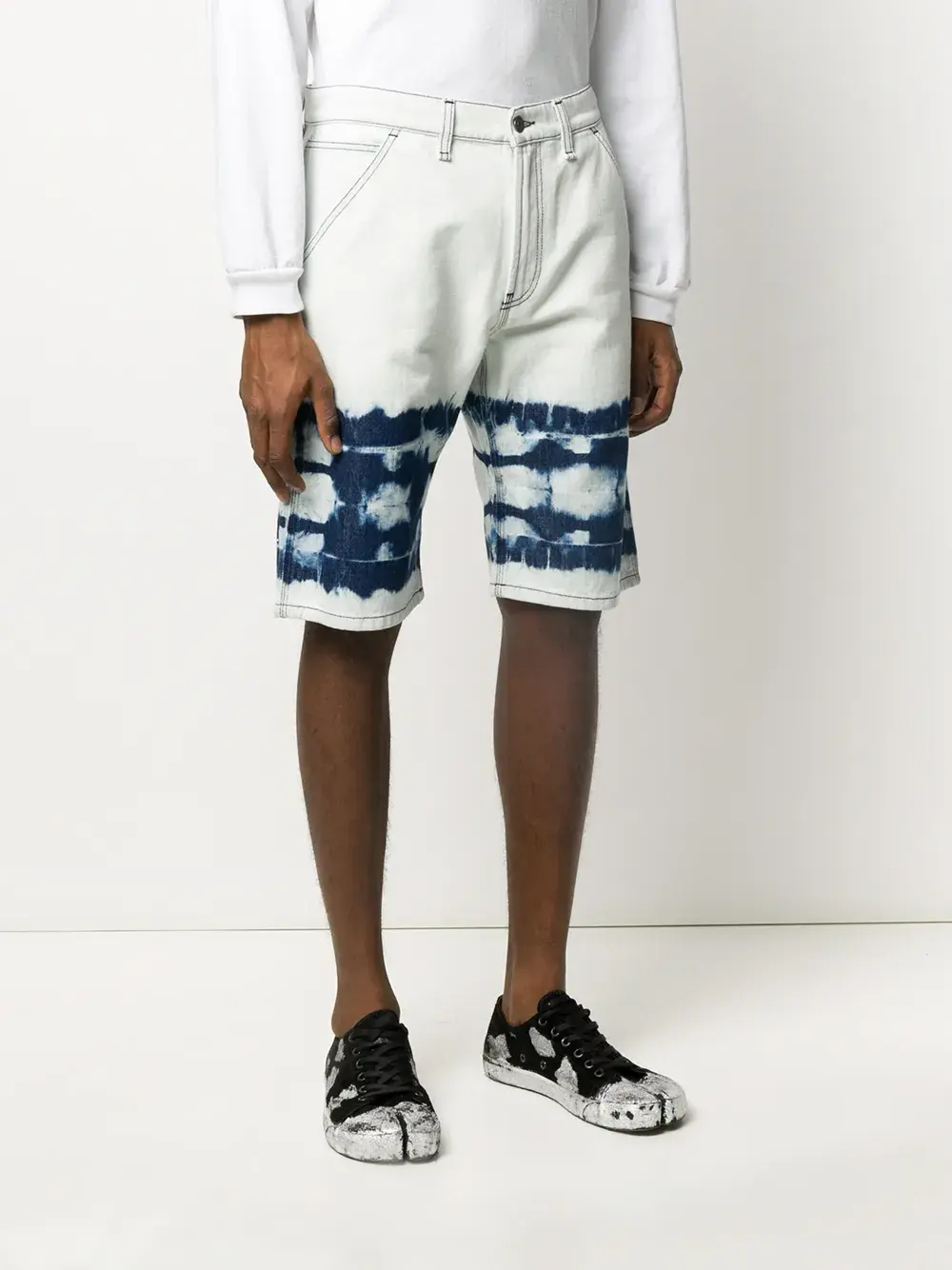Джинсовые шорты с абстрактным принтом от MSGM. Петли для ремня, ширинка на молнии с пуговицей, прорезные карманы по бокам, два накладных задних кармана, прямые брючины, абстрактный принт и длина по колено. Цвет: синий.