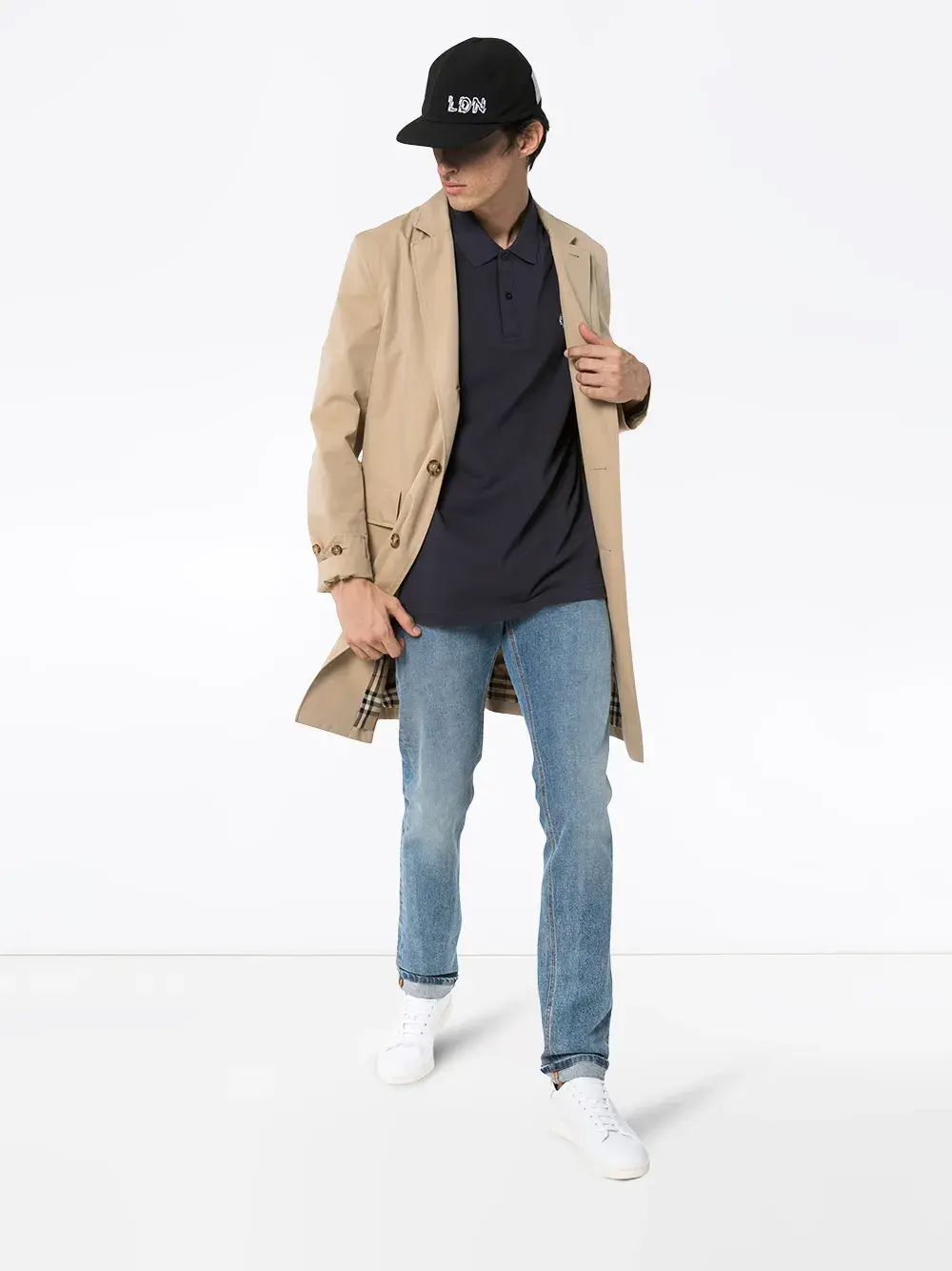Воротник поло, вышитый логотип на груди, короткие рукава и прямой подол.